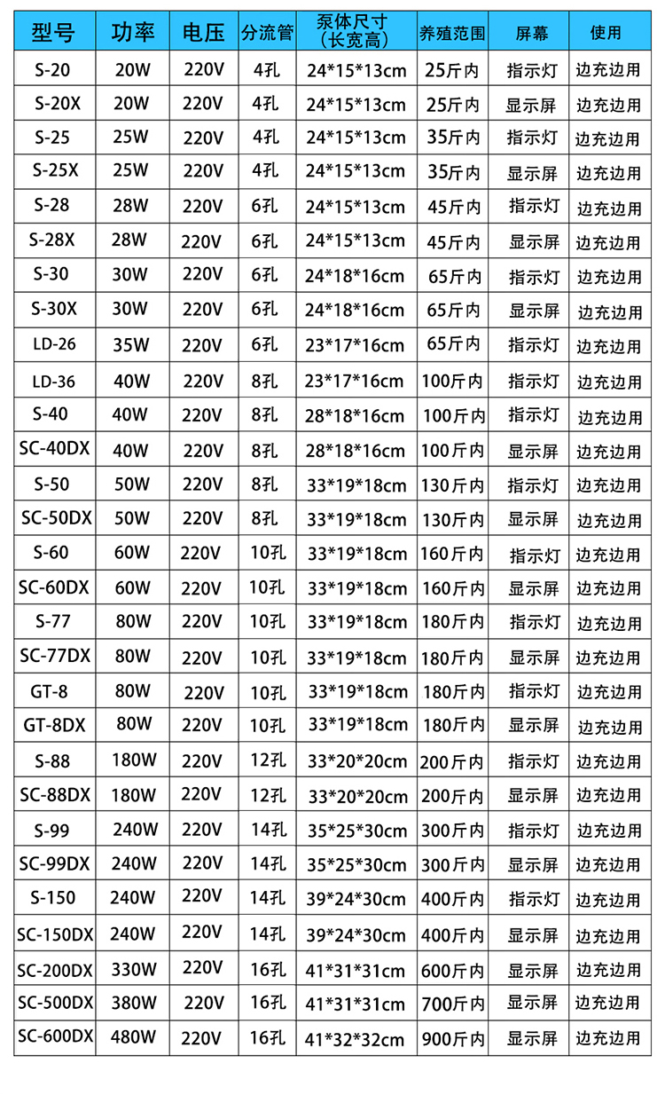 SC-20 + Farming range 20 kg fish + 4 holes full set + working while charging SC-20DX + breeding range 20 kg fish + 4 hole aerosite + charging while working SC-30DX display model + tube 15 + sand head 6 + valve SC-30 + breeding range 40 kg fish + 6 holes full set + while charging SC-40 + breeding range 70 kg fish + 8 holes SC-40 + breeding range 70 kg fish + 8 holes + 8 gas disc SC-40DX + breeding range 70 kg fish + 8 hole SC-40DX + Breeding range 70 kg of fish + 8 holes + 8 gas disc SC-50 + breeding range 100 kg of fish + 8 holes SC-50DX + breeding range of 100 kg of fish + 8 holes SC-50DX + breeding range of 100 kg of fish + 8 holes + 8 gas pan SC-60 + breeding range of 120 kg of fish + 10 holes SC-60 + breeding range of 150 kg of fish + 10 holes + 10 holes SC-60DX + breeding range of 120 kg of fish + 10 holes SC-60DX + breeding range of 150 kg of fish + 10 holes + 10 gas plate SC-77 + breeding range 150 kg of fish + 10 holes SC-77DX + breeding range 150 kg of fish + 10 holes SC-88 + breeding range of 200 kg of fish + 12 holes SC-88 + breeding range of 200 kg of fish + 12 holes + 12 holes SC-88DX + breeding range of 200 kg of fish + 12 holes SC-88DX + breeding range of 200 kg of fish + 12 holes + 12 gas disc SC-99 + breeding range of 300 kg of fish + 14 holes SC-99+ Breeding range 300 kg of fish + 14 holes + 14 gas disc SC-99DX + breeding range of 300 kg of fish + 14 holes SC-150 + breeding range of 400 kg of fish + 14 holes SC-150DX + breeding range of 400 kg of fish + 14 holes SC-200DX + breeding range of 500 kg of fish + 16 holes SC-500DX + breeding range of 600 kg of fish + 16 holes of the full sc-600DX + breeding range of 800 kg of fish + 16 holes