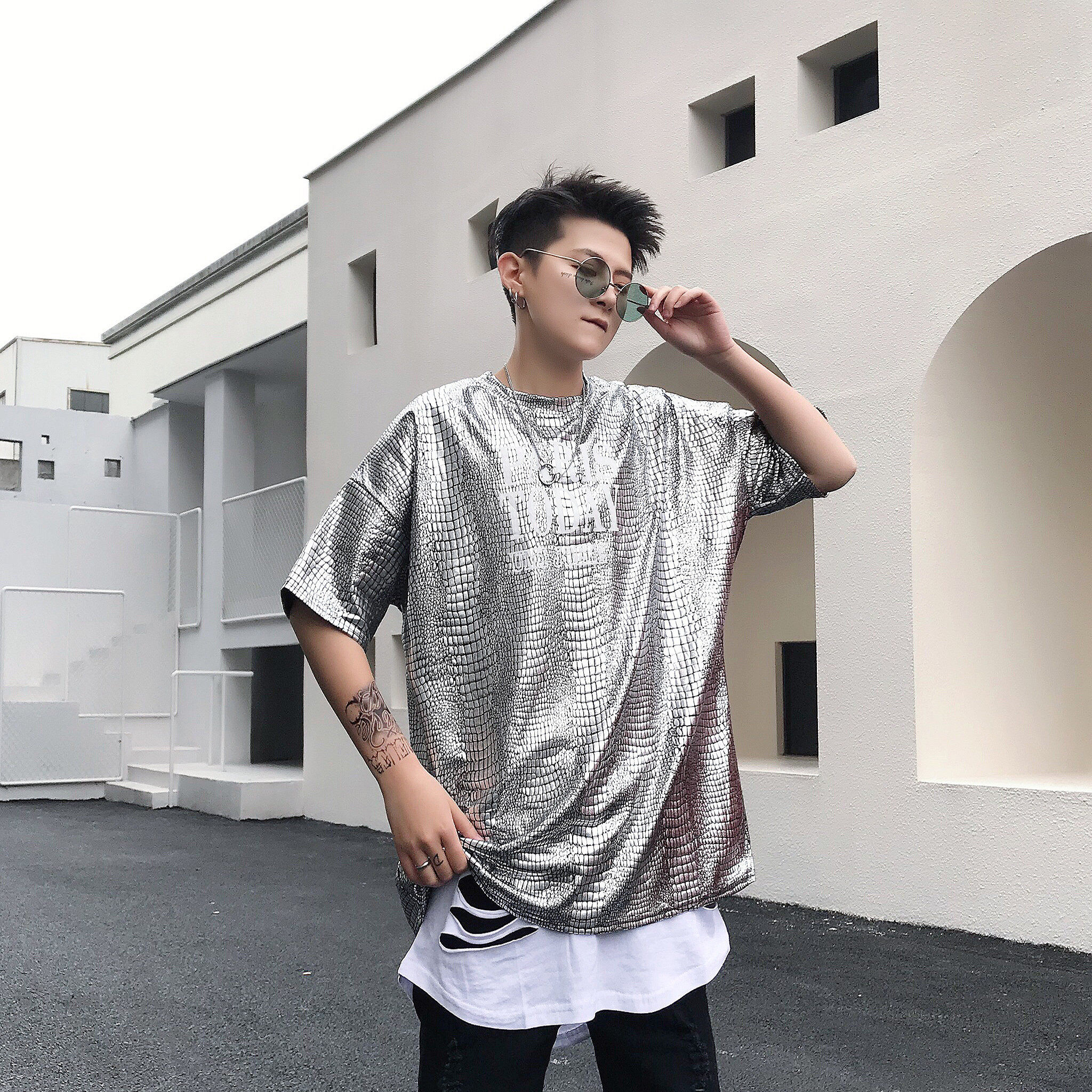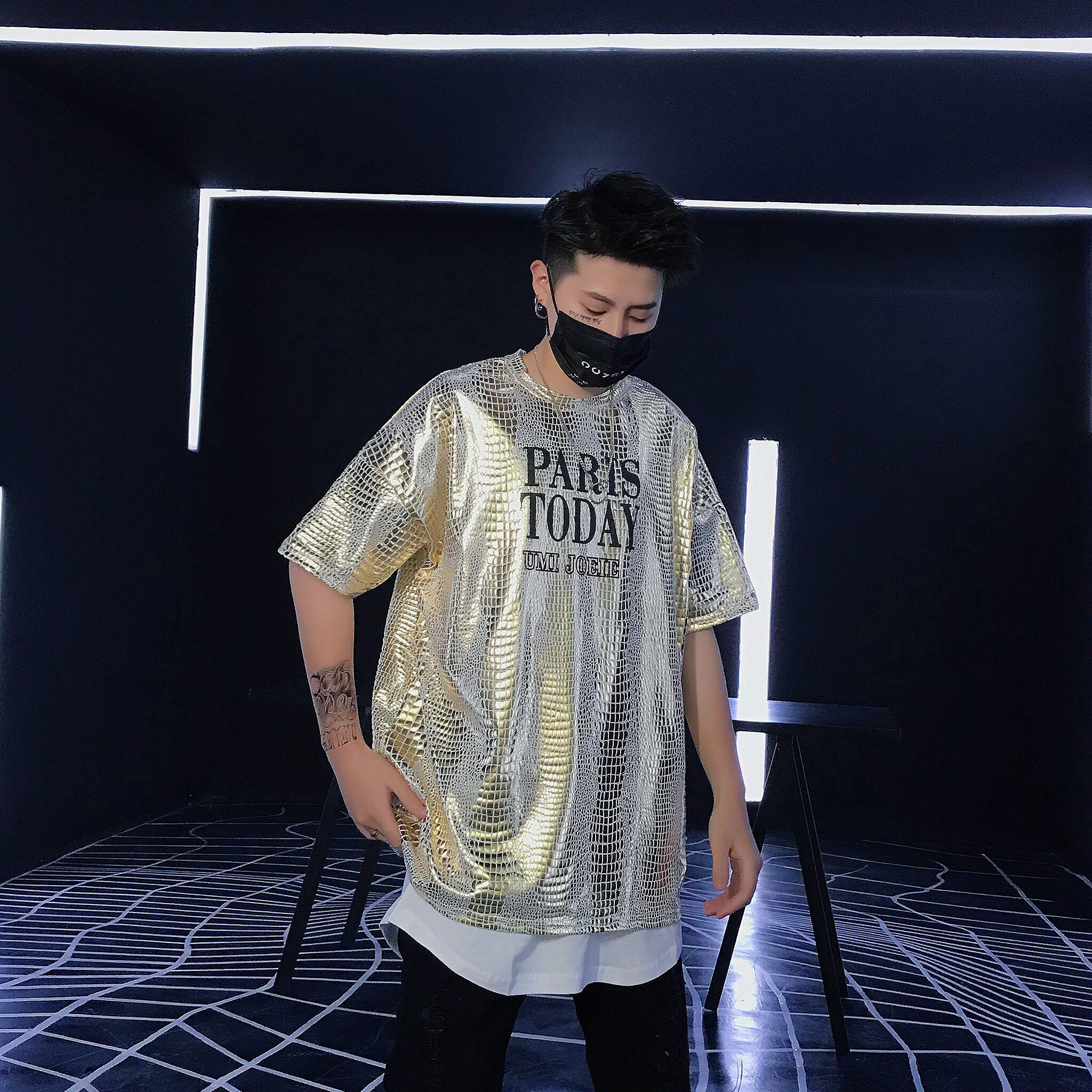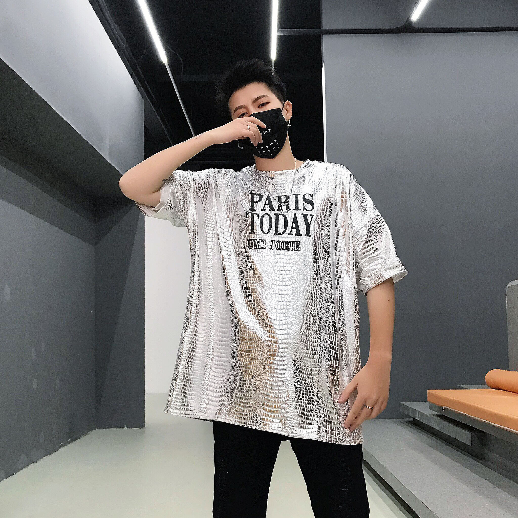 The loose hip hop wind 22 summer men perform young men's leisure short sleeve T - shirt perform bright gold and silver shirt