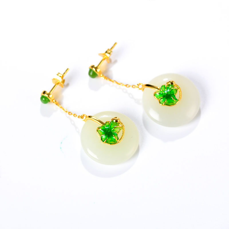 New gold-plated Hetian Jade peace buckle set necklace with ring earrings three-piece set of white jade jewelry
