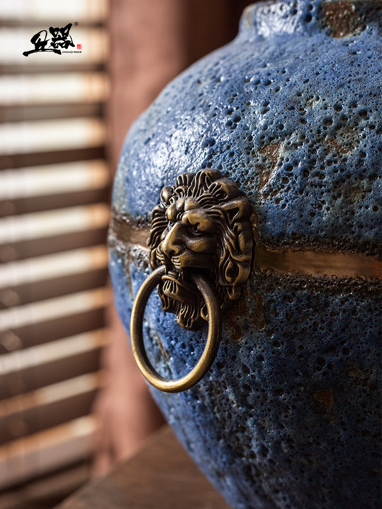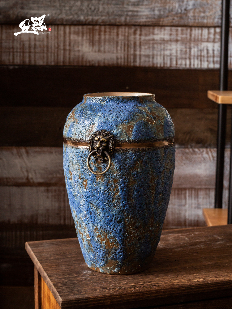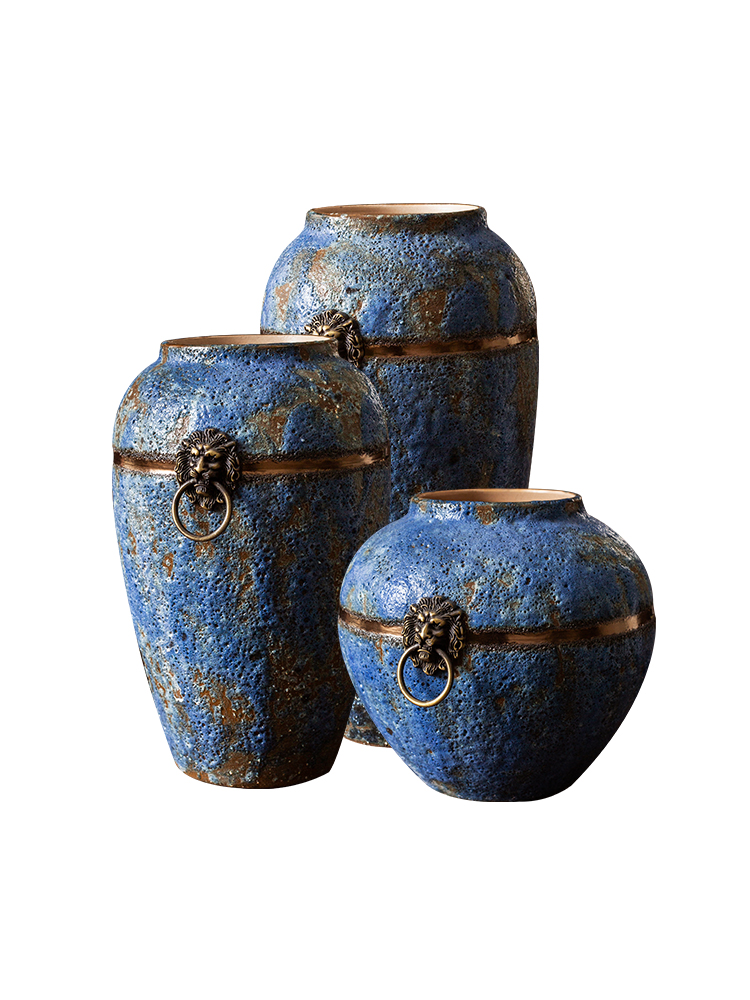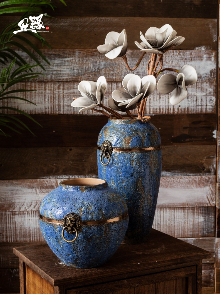Retro blue Chinese-style ceramic vase made of old pottery pot living room flower arrangement flower arrangement three-piece set of rough pottery vase