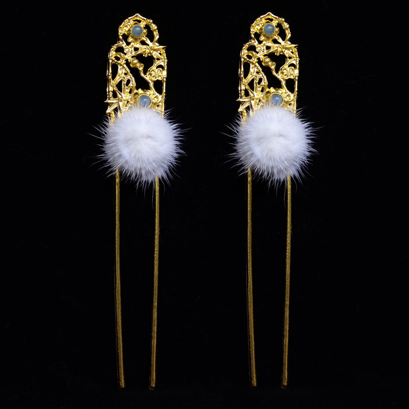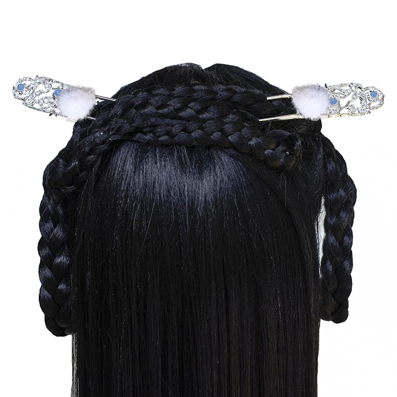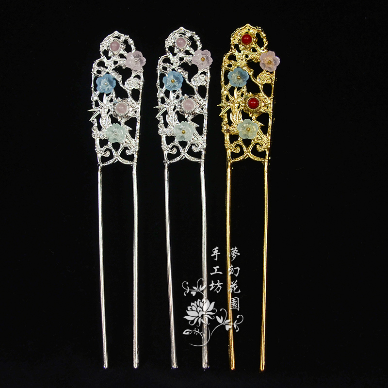 A pair of silver inlaid pink crystal hairpins A pair of silver inlaid chrysoprase hairpins A pair of silver inlaid blue jade hairpins A pair of silver pink crystal fringed hair balls A pair of silver chrysoprase fringed hair balls A pair of silver blue jade fringed hairs