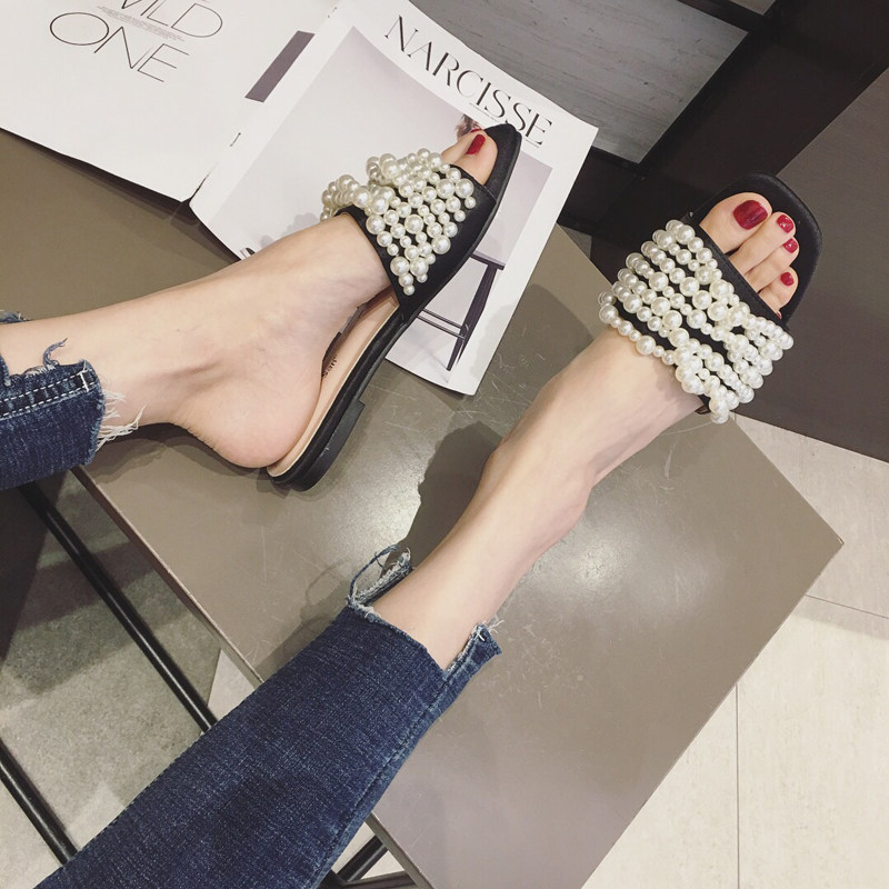 Tide brand fashion all-match outer wear pearl slippers 2022 summer new sandals female bohemian open-toe one-word slippers