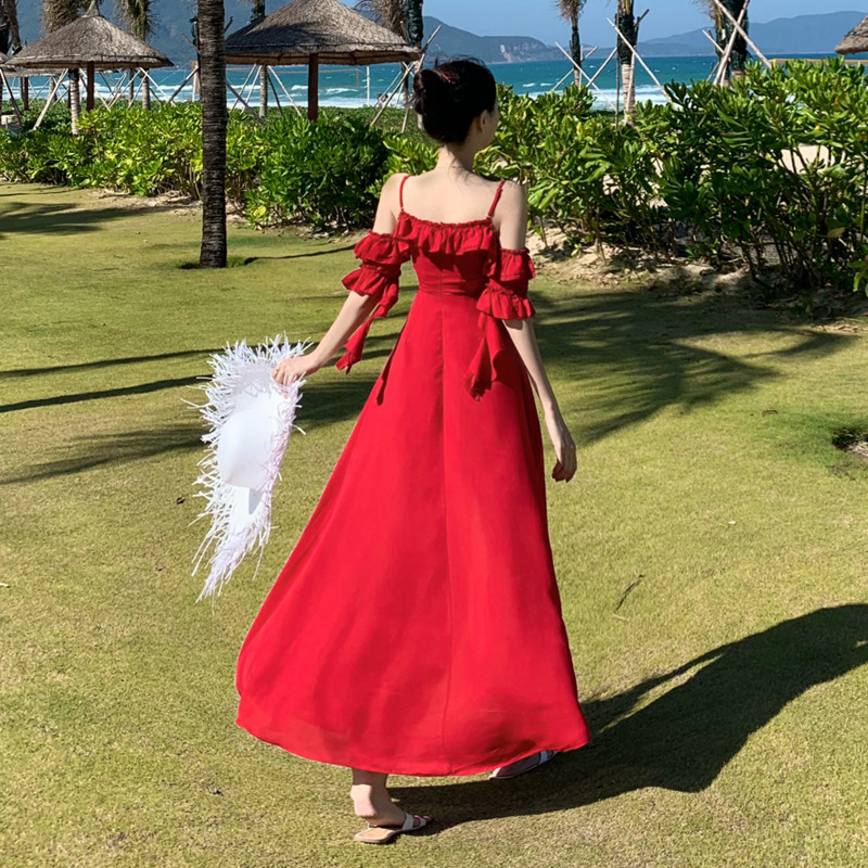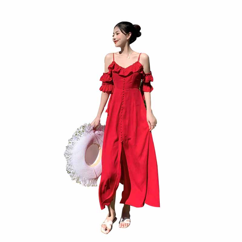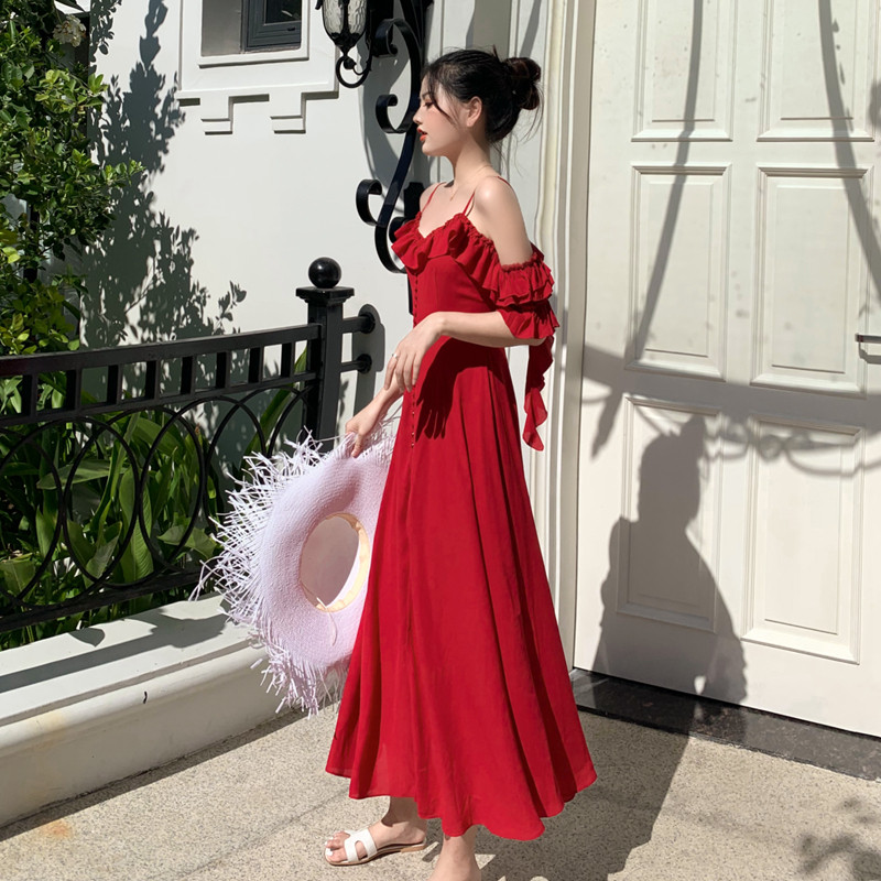 Summer New Halter Solid ruffle off-the-shoulder single breasted Hepburn style long dress Halter skirt