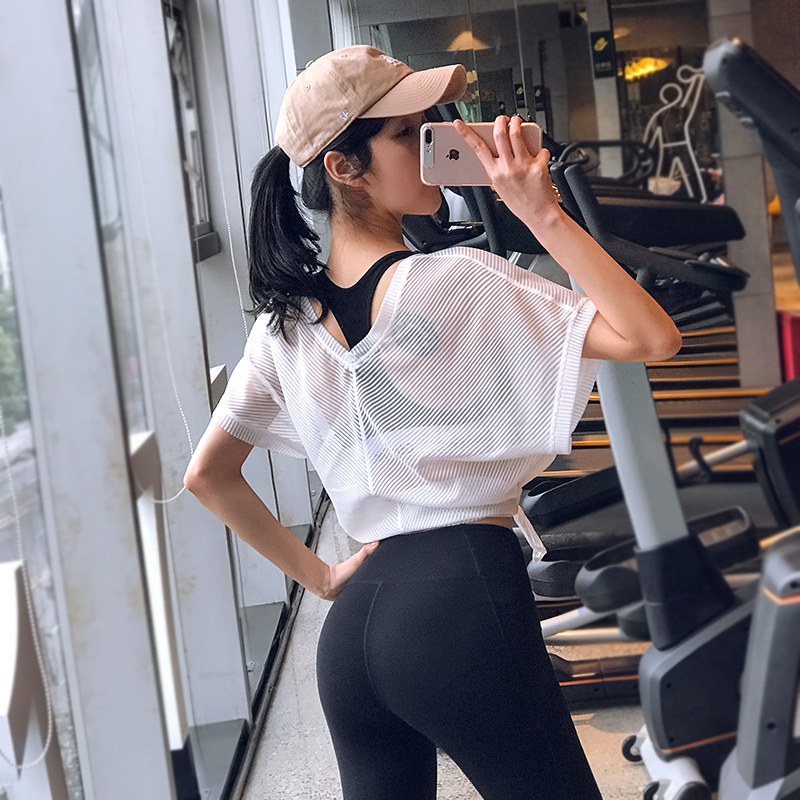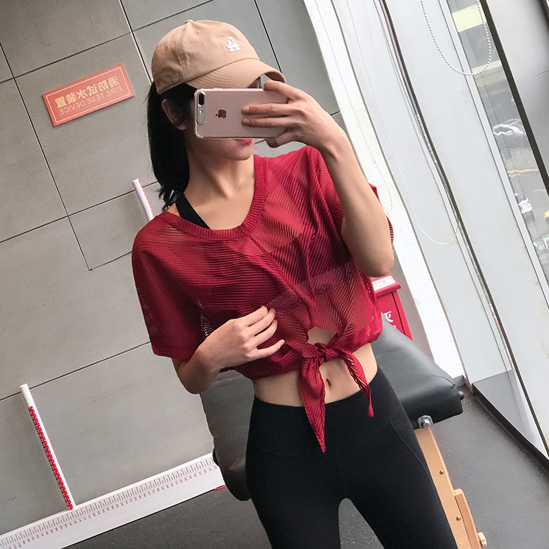 Loose umbilical mesh sports T-shirt women's quick-drying running short-sleeved top breathable gym yoga suit blouse summer