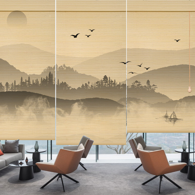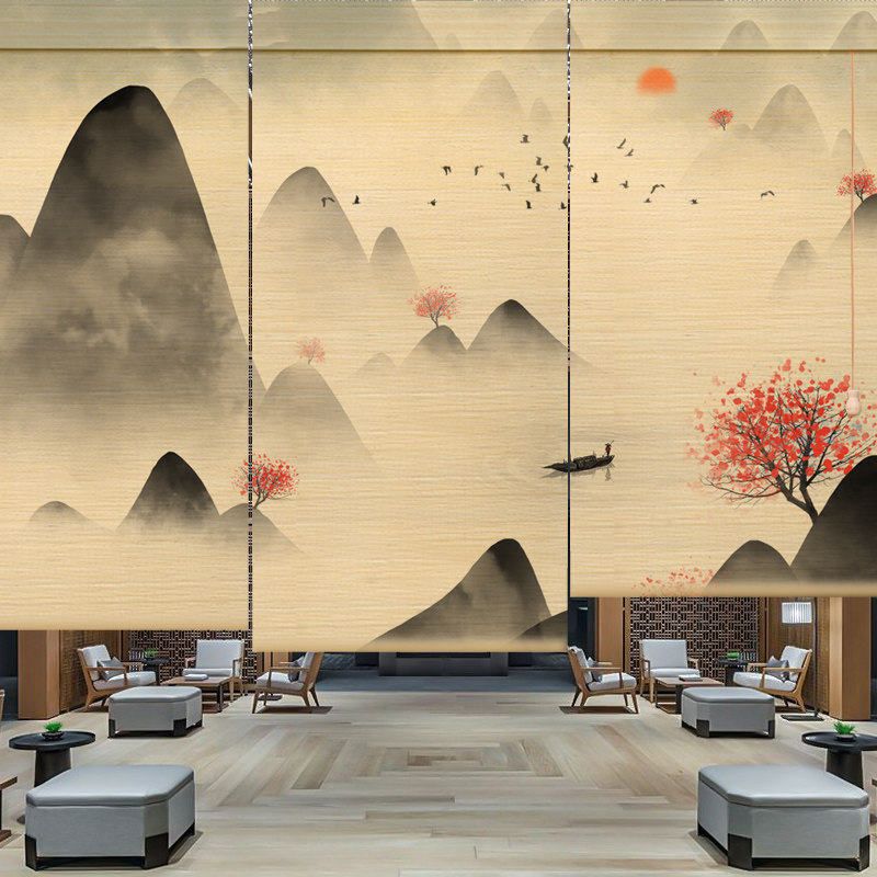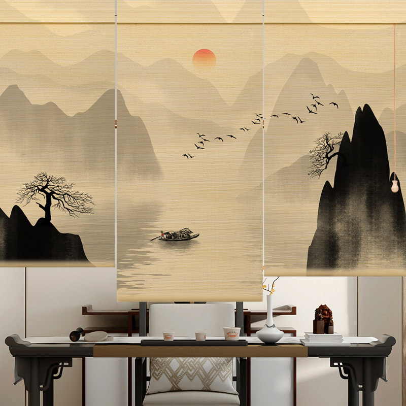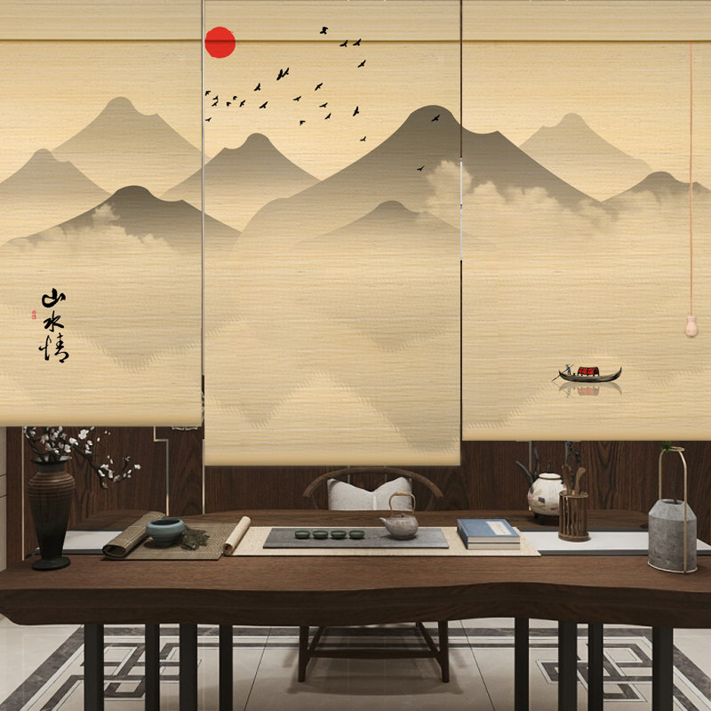 Bamboo blinds Chinese style printed roller blinds shade lifting shading curtain partition Restaurant hotel Home Commercial with custom-made door curtain-Taobao