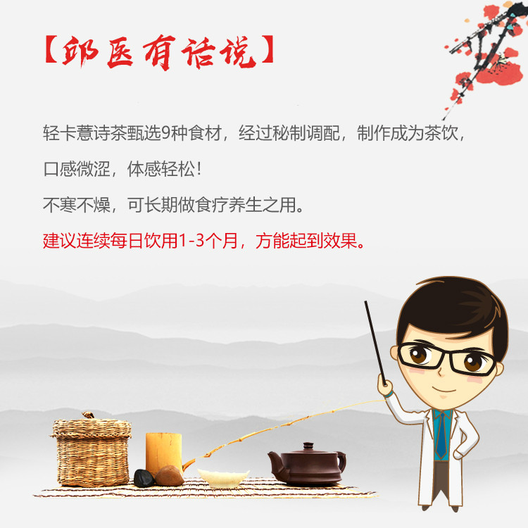 Coix seed, red adzuki bean, licorice, hawthorn, poria, orange peel, pueraria root, lotus leaf, yam