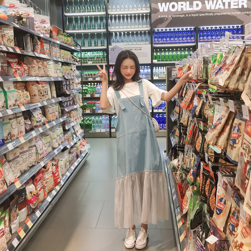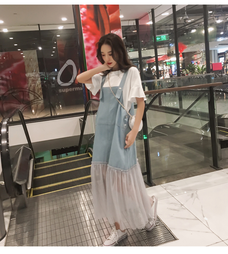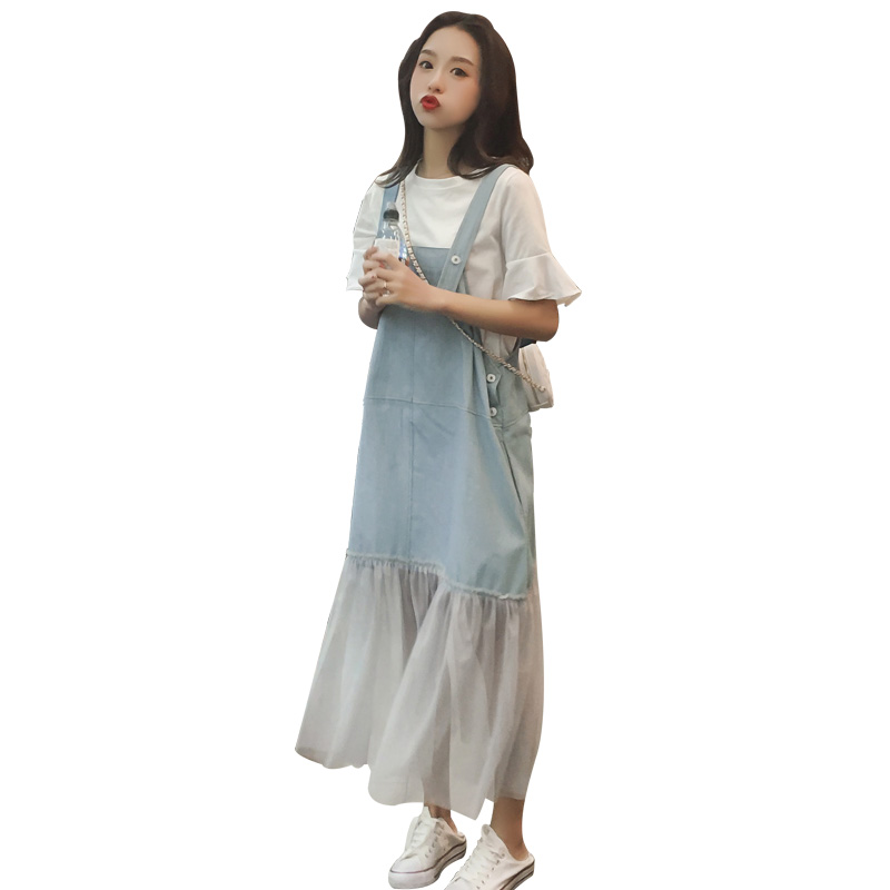 Summer fit Korean version large size gestational woman dress two sets denim fashion denim fashion denim baby bag skirt summer hanging strap skirt