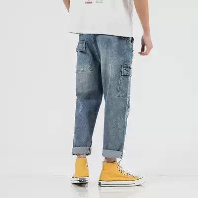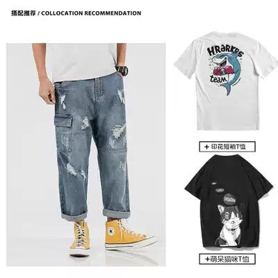 2021 autumn personality hole nine points jeans men's loose large size sports straight pants Korean version of the Tide men's pants