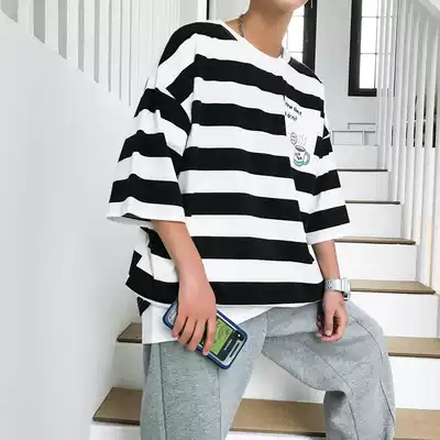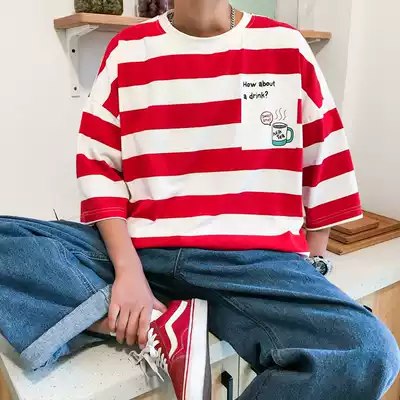 T-shirt Men's short-sleeved striped net red T-shirt tide brand all-match loose bf wind ins super fire cec Hong Kong wind three-point sleeve 7 points