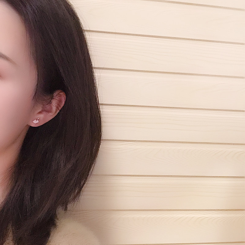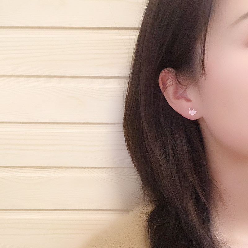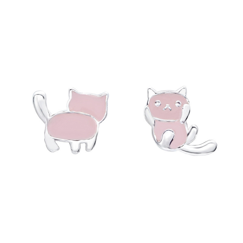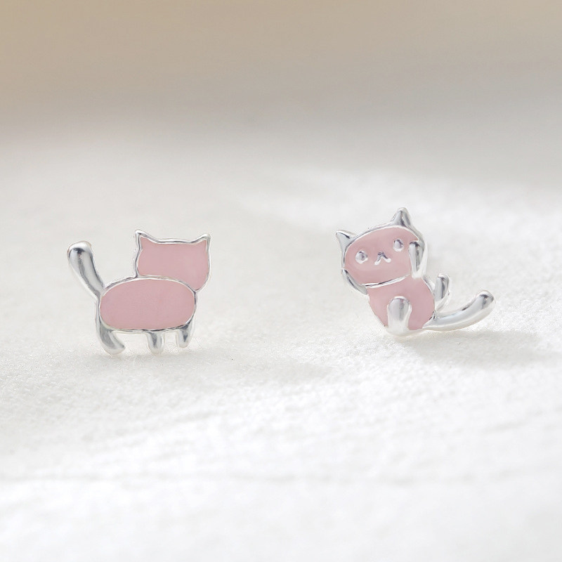 925 Pure Silver Kitten Asymmetrical Earshot Woman Temperament Pink Teenage Girl Hearts Earrings Korea Small Personality Brief