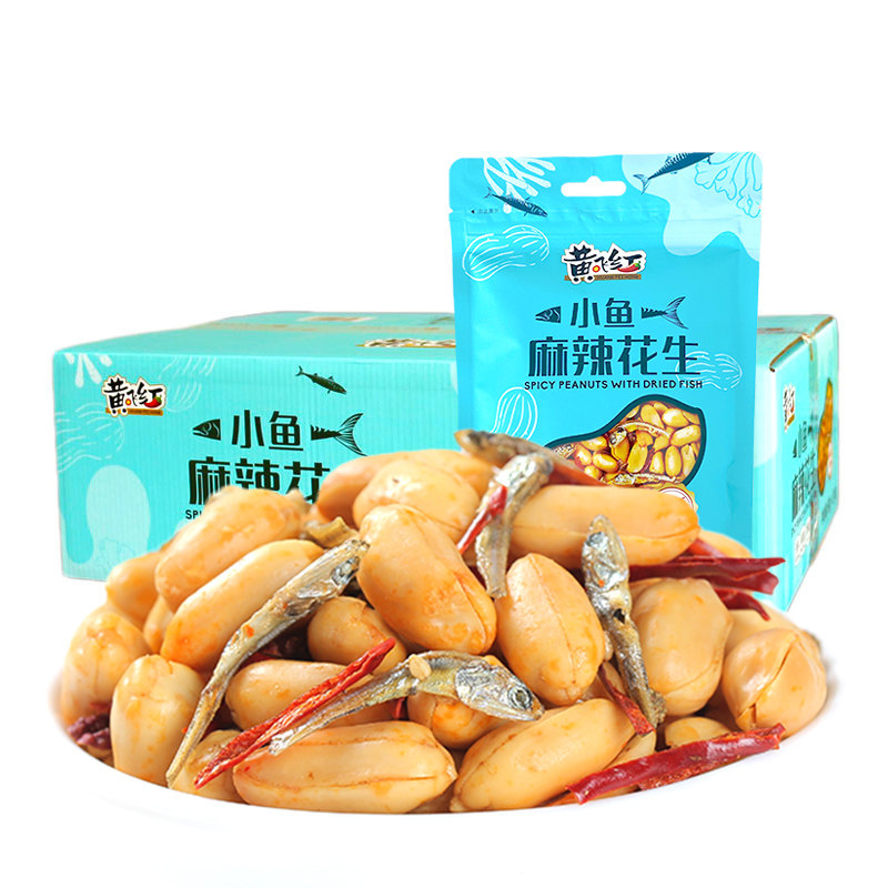 Huangfei red and yellow hot fish dry shrimp peanut 98g*24 full box of nut snacks in Shandong specialty products