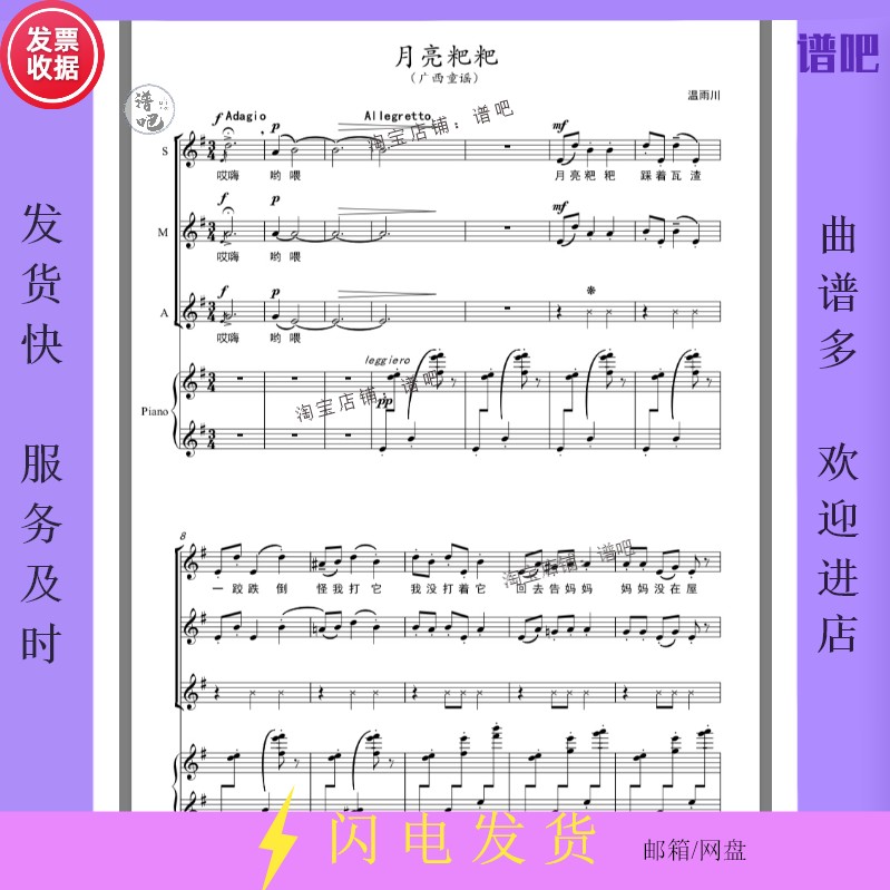 Moon Baba children's voice three parts Guangxi nursery rhymes original chorus score notation+staff piano accompaniment score