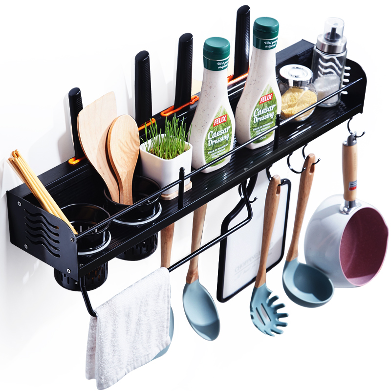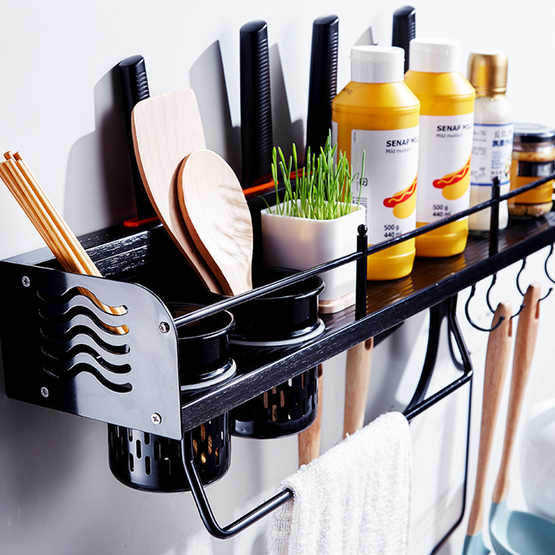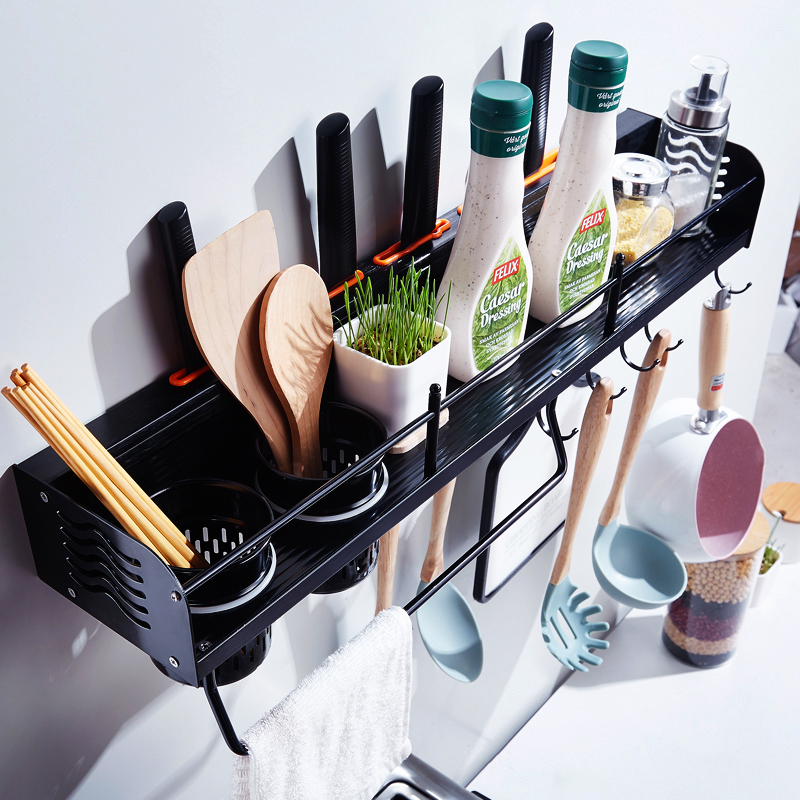 Nordic Free Punching Kitchen Black Space Aluminum Shelve Wall-mounted Tool Holder for Home Seasonings Rack