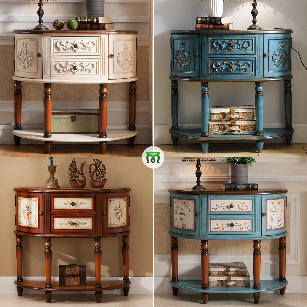 Semicircle table leaning against wall red wood color Xuanguan Table American color painted retro white Xuanguantai Aisle Blue Decorative Table Art.