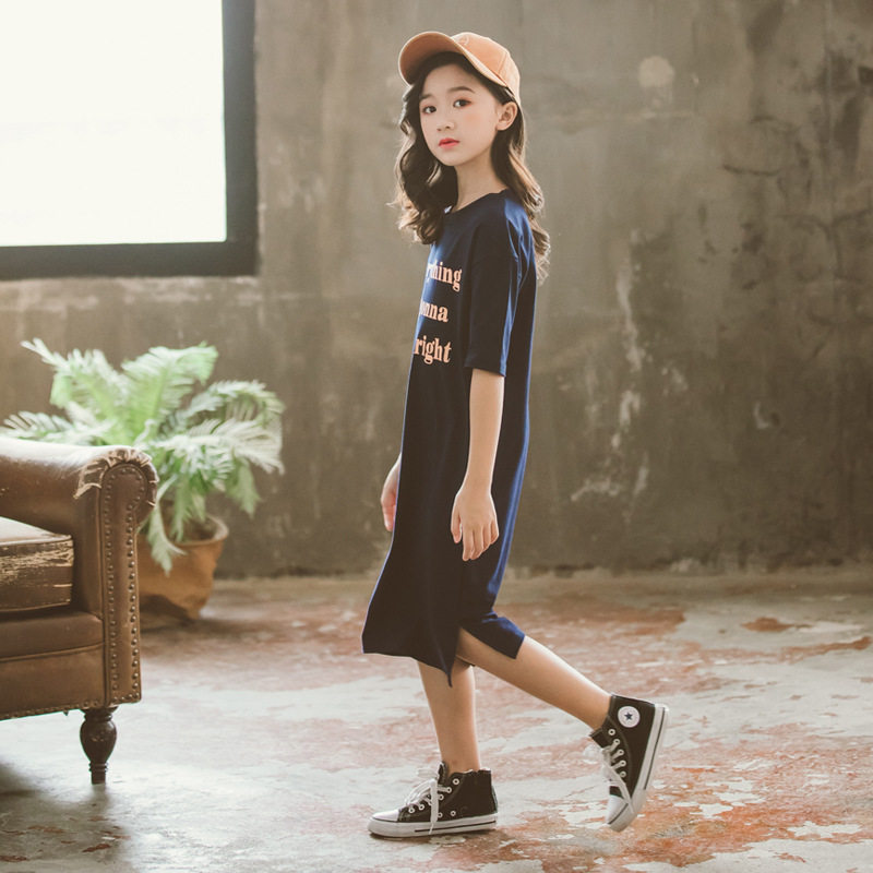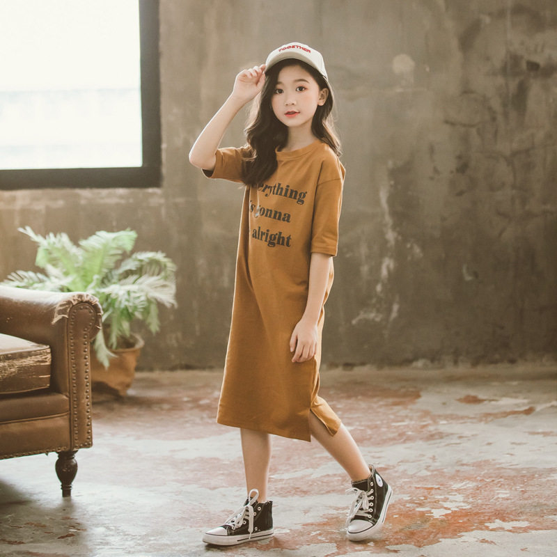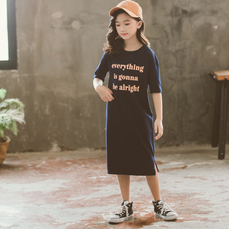 Girls' parent-child long skirt 2020 summer dress new middle-aged children's cotton short-sleeved letter printing casual dress