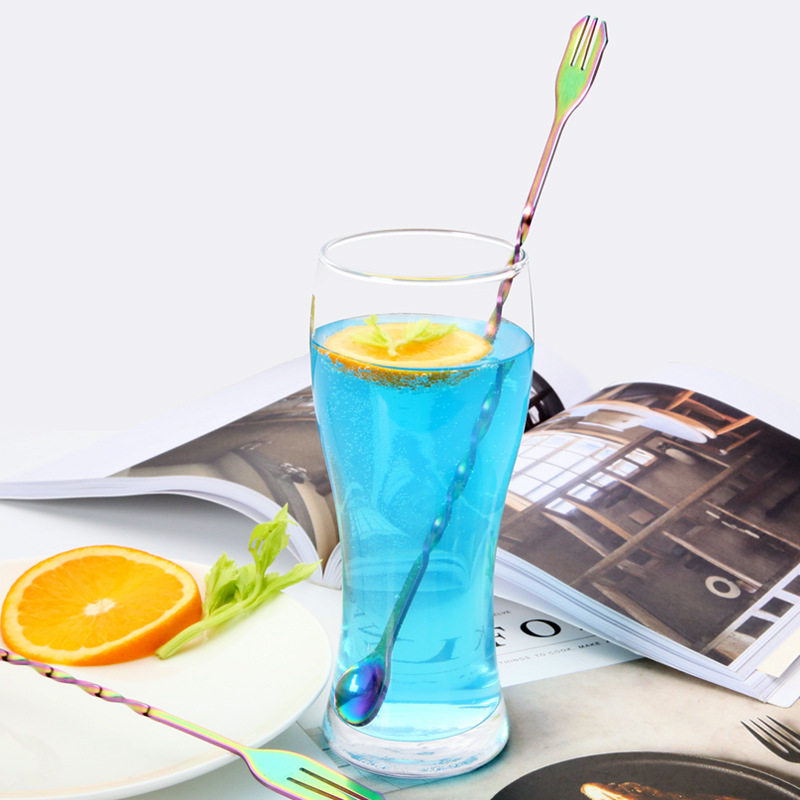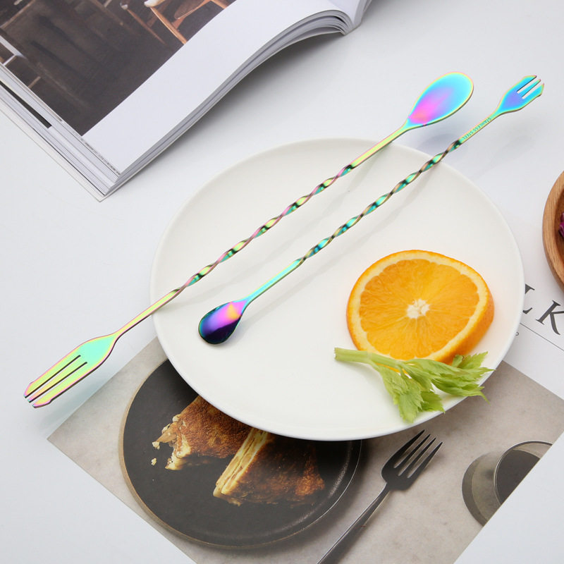 32cm threaded stainless steel ice spoon lengthened cocktail spoon double-headed bar spoon net red drink mixing spoon fruit fork