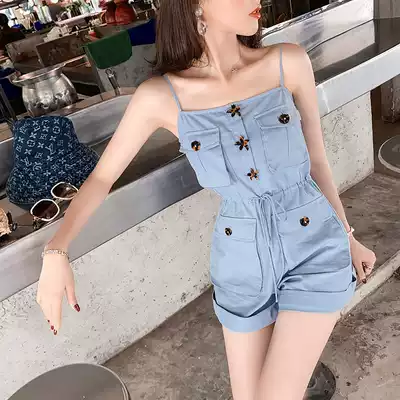 Sling jumpsuit women's wide leg pants summer new Korean version of high waist slim blue fashionable tooling