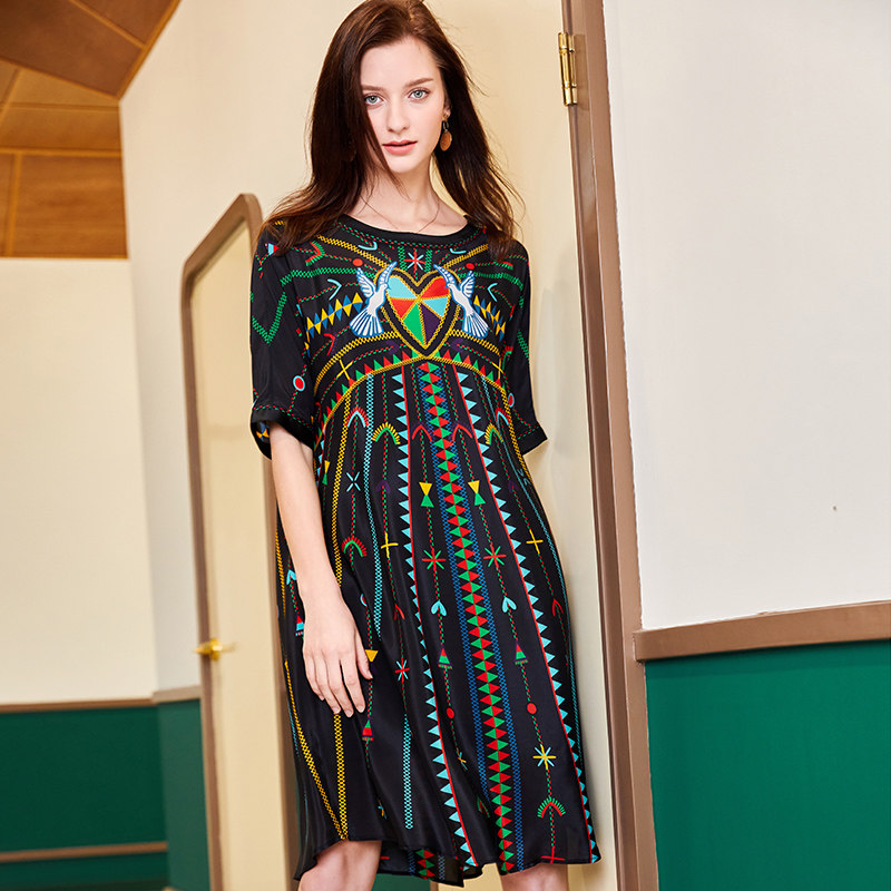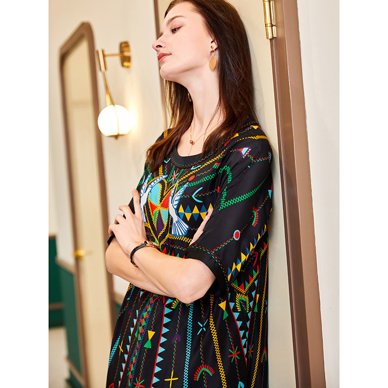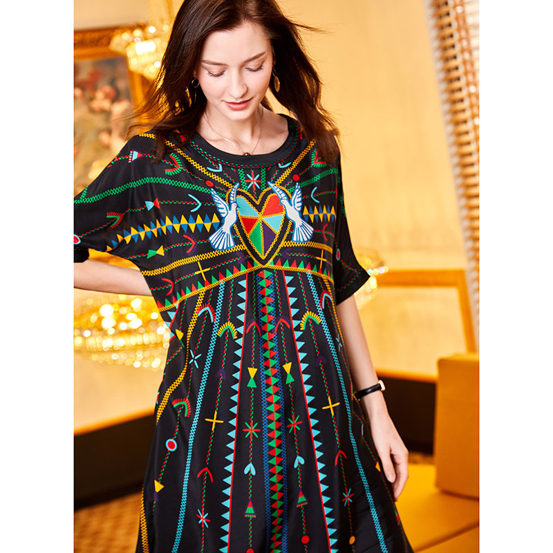 U N Q exotic vacation style embroidery printing loose bat sleeve silk silk Mulberry silk dress woman