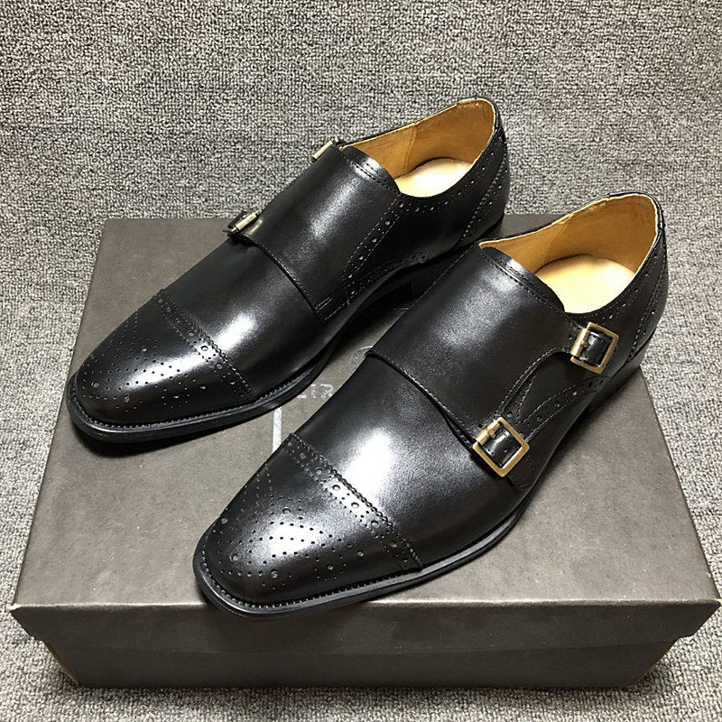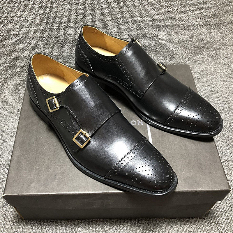 British triple-connected Block men shoes sculptures leather pointy black business dress shoes button shoes