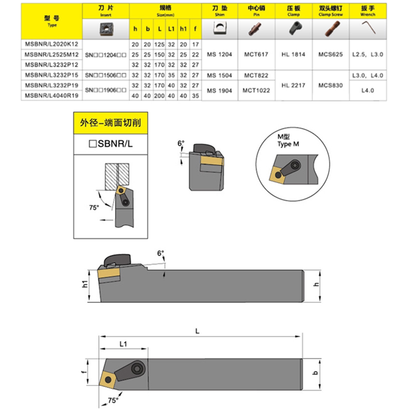 MSBNR1616H12 positive knife 16 square MSBNL1616H12 counter knife 16 square MSBNR2020K12 positive knife 20 square MSBNL2
