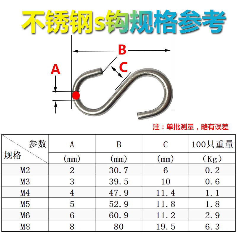 304 Stainless Steel S Hook Hook Hook Coat Hook Kitchen Sausage Bacon Hook M 2 3 4 5 6 8