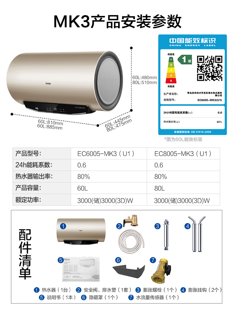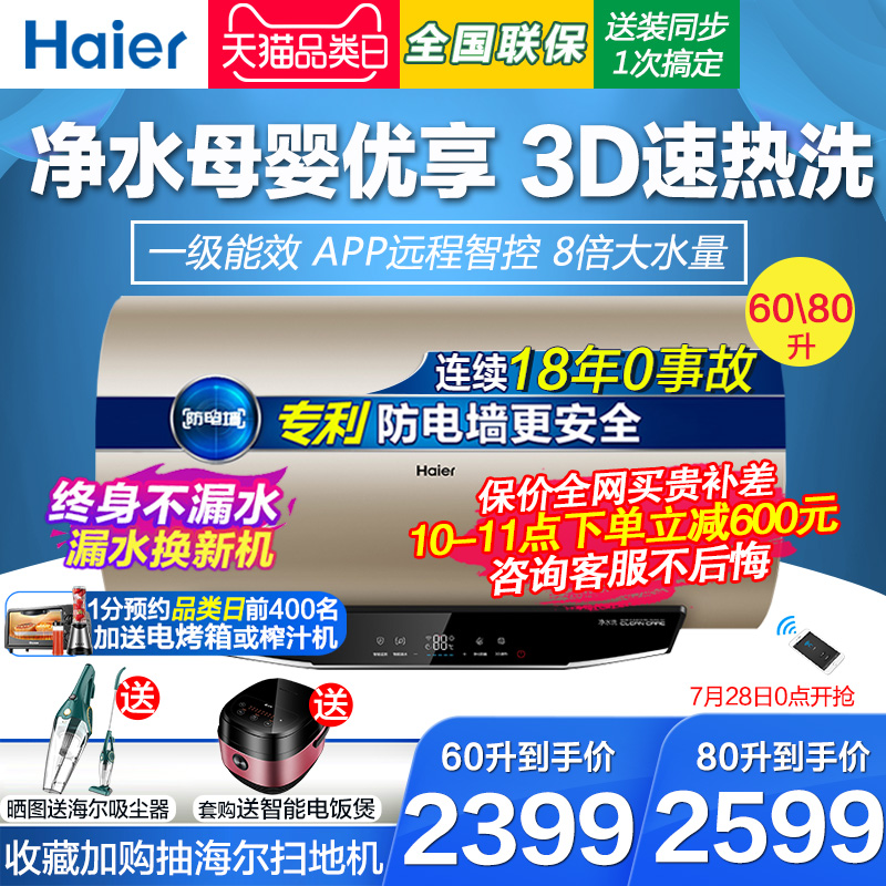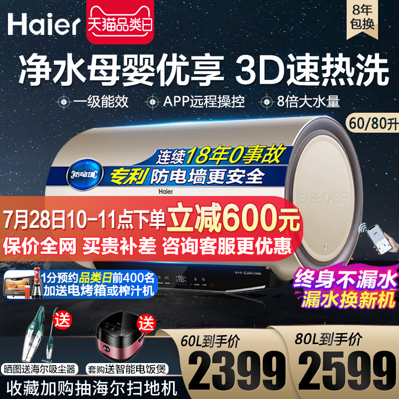 Haier MK3 electric water heater intelligent water purification washing 3D speed heat household 60 liters L powder room bath 80 liters water storage type