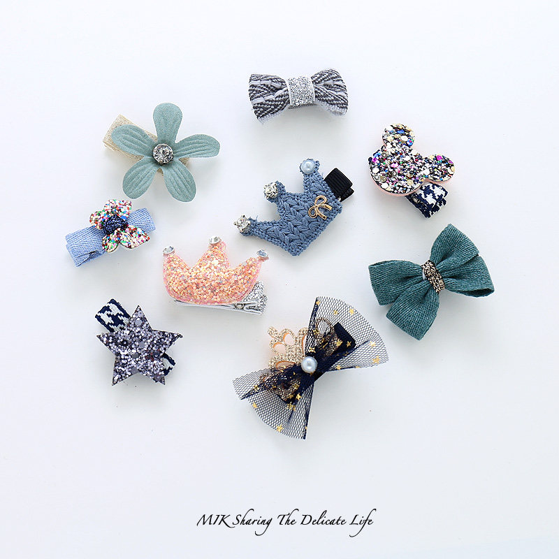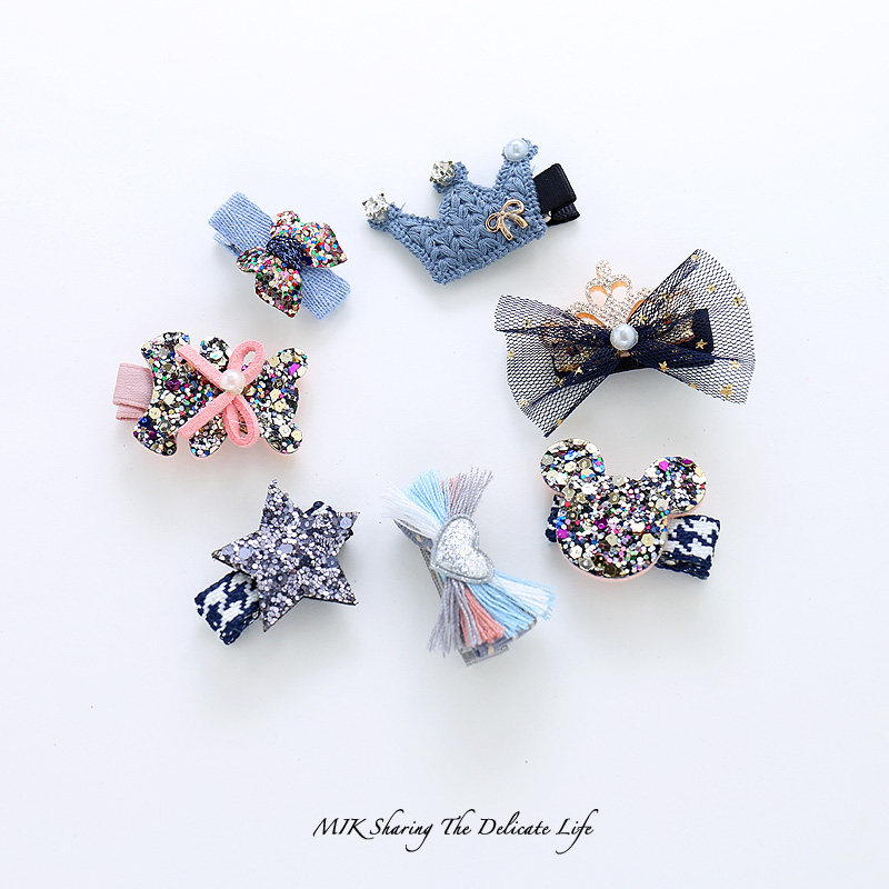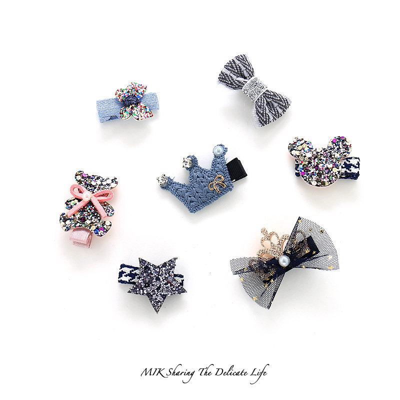 1#藏青网纱皇冠(clip) 2#蓝绿大蝴蝶结3#粉亮片皇冠4#暗粉星星网纱花5#蓝色钩带蝴蝶结6#金星蓝绿小蝴蝶7#绿色超纤