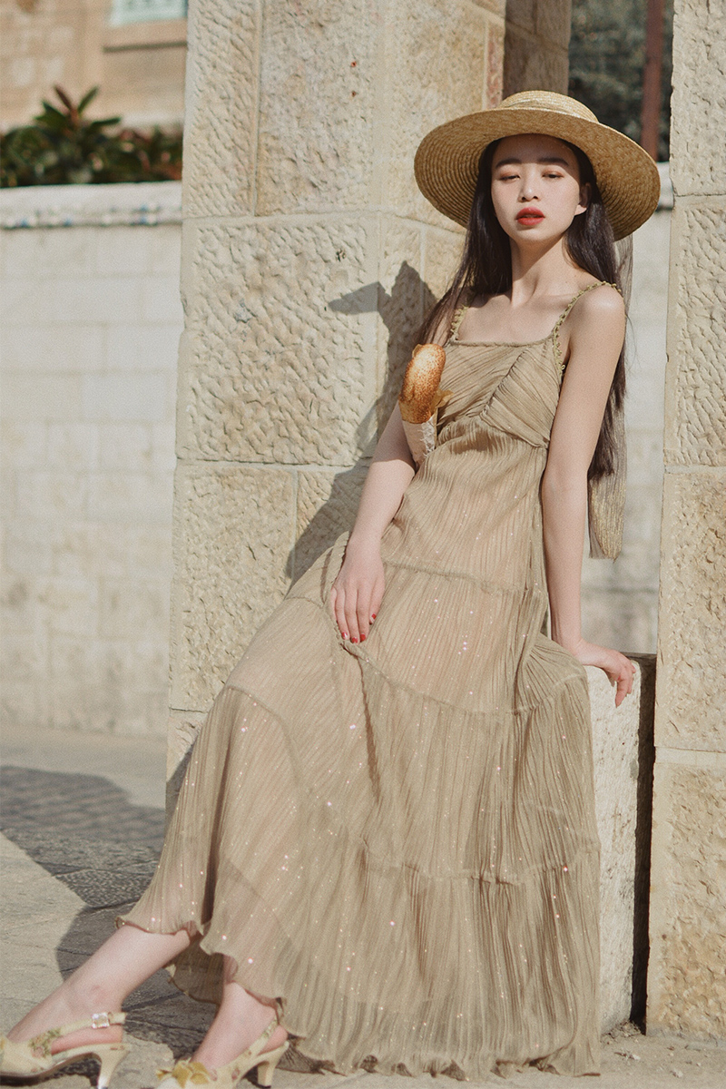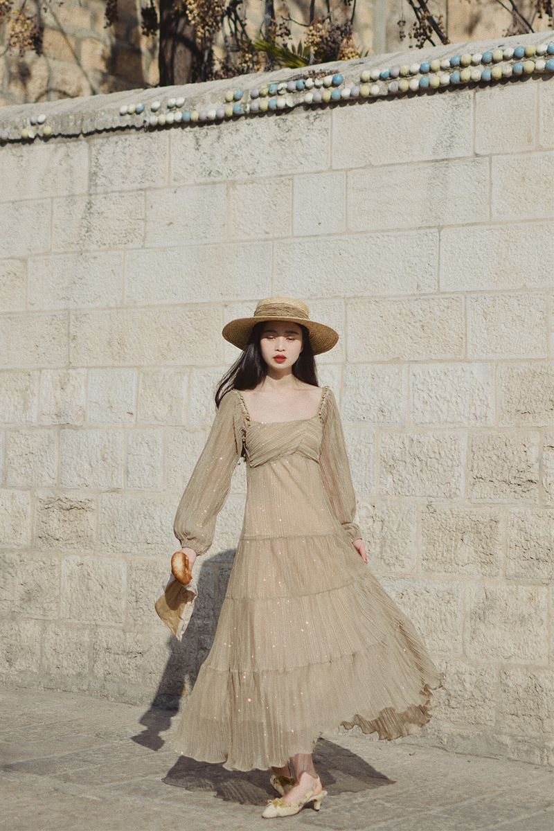 "She is more lonely than fireworks 2" retro mesh pleated gilding double dress New