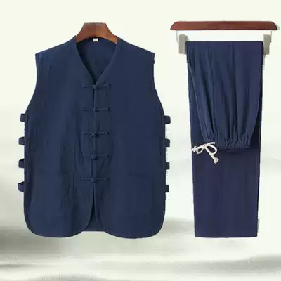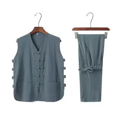 Summer cotton and linen sleeveless Tang suit jacket vest undershirt vest suit Chinese retro casual Hanfu two-piece suit