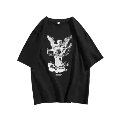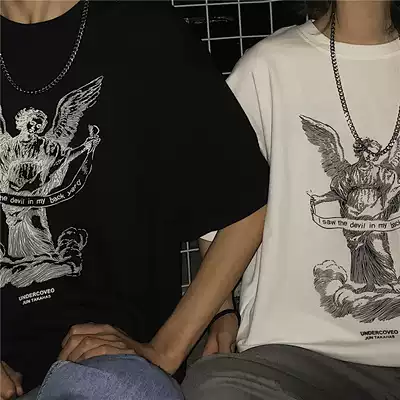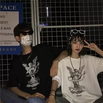 Tide brand ins simple and all-match short-sleeved men's trend five-point sleeve Harajuku Port style T-shirt women's loose angel printed top