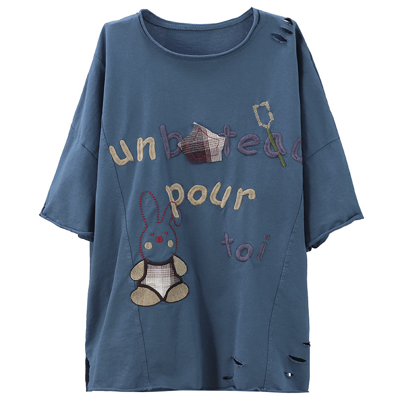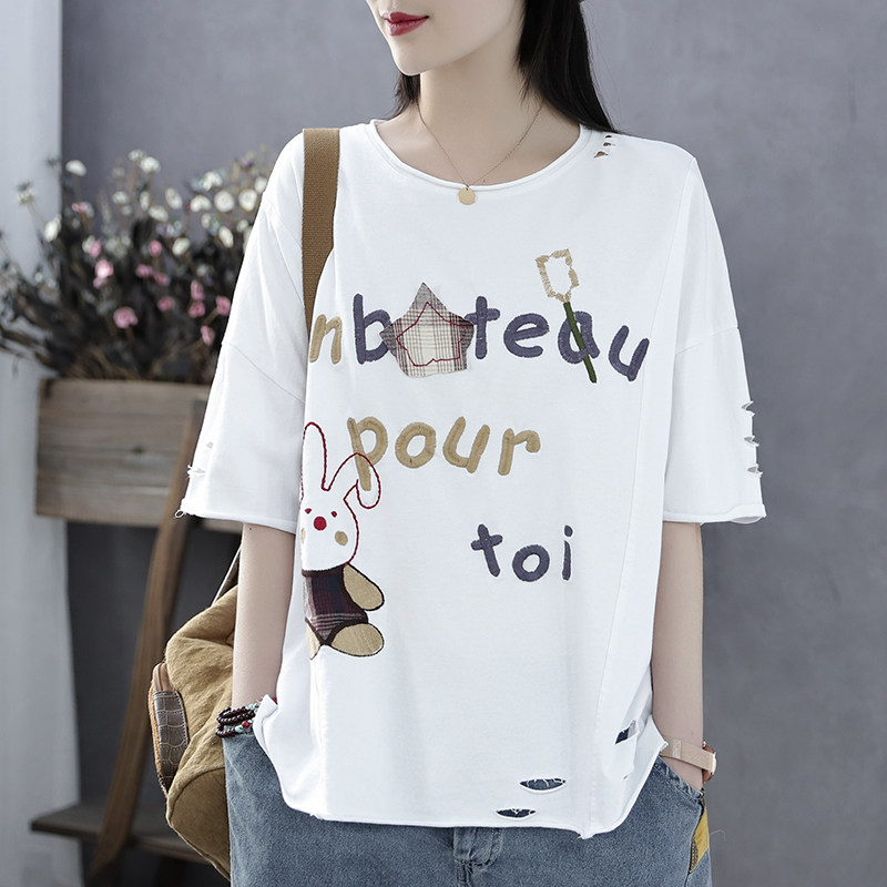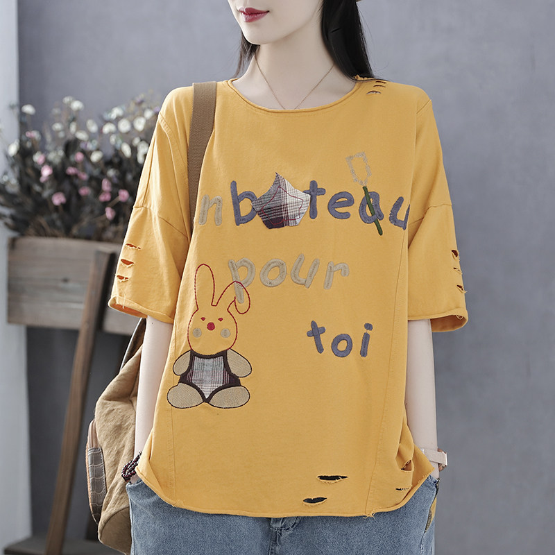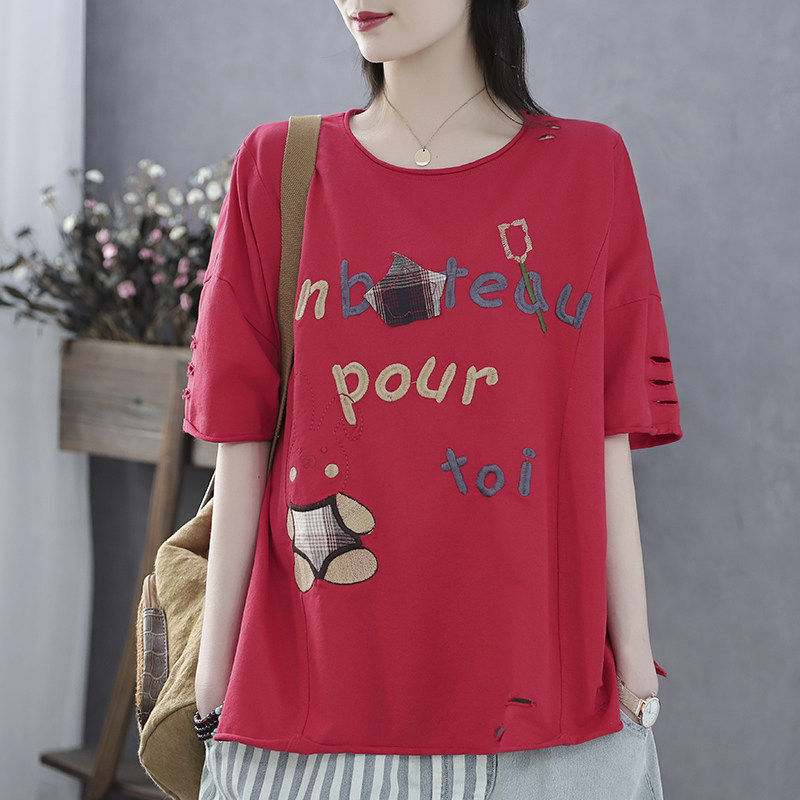 Han Soi retro summer new cloth patch embroidery terry cotton top hole loose five-point sleeve short-sleeved t-shirt women