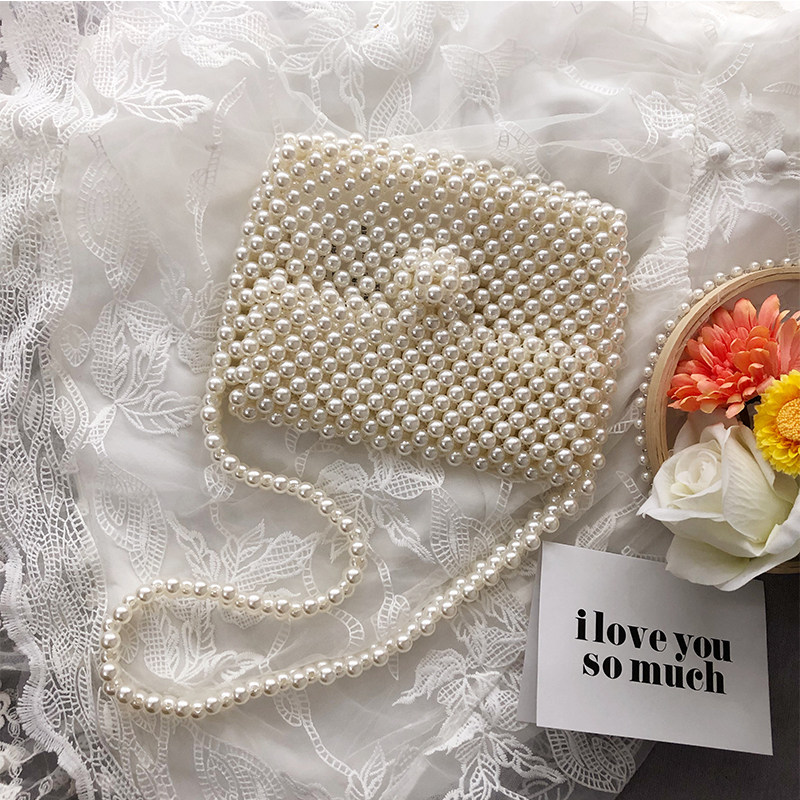 UGALS Retro Rework Nets Red Ins Handwoven String Beads Clamshell Lock Pearl Bag Single Shoulder Inclined Satchel Bag