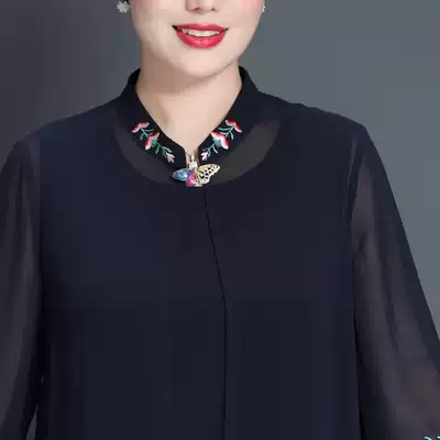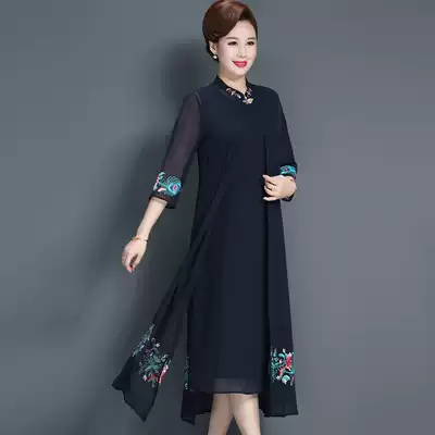 Middle-aged and elderly Noble Silk dress embroidery wide wife knee skirt temperament fat mother plus fat plus size