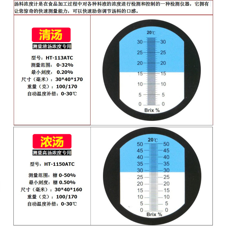 Measuring the sugar degree of the soup with 0-32 % copper fuselage (HT113ATC) measuring the soup sugar degree with 0-50 % copper body (HT1150ATC) sugar degree 0-1