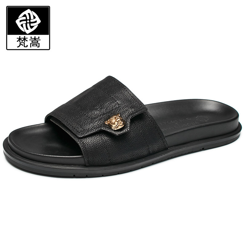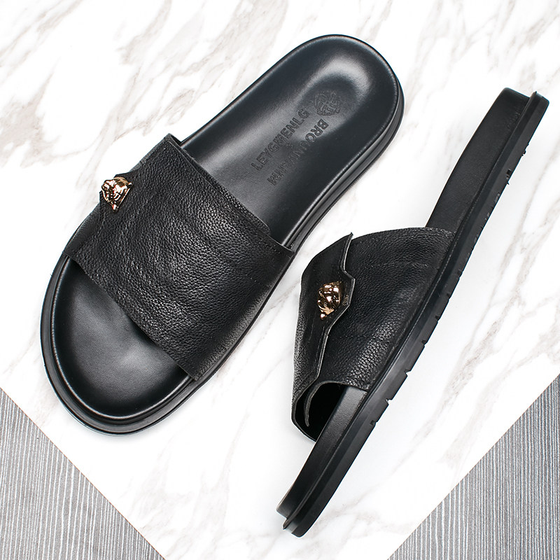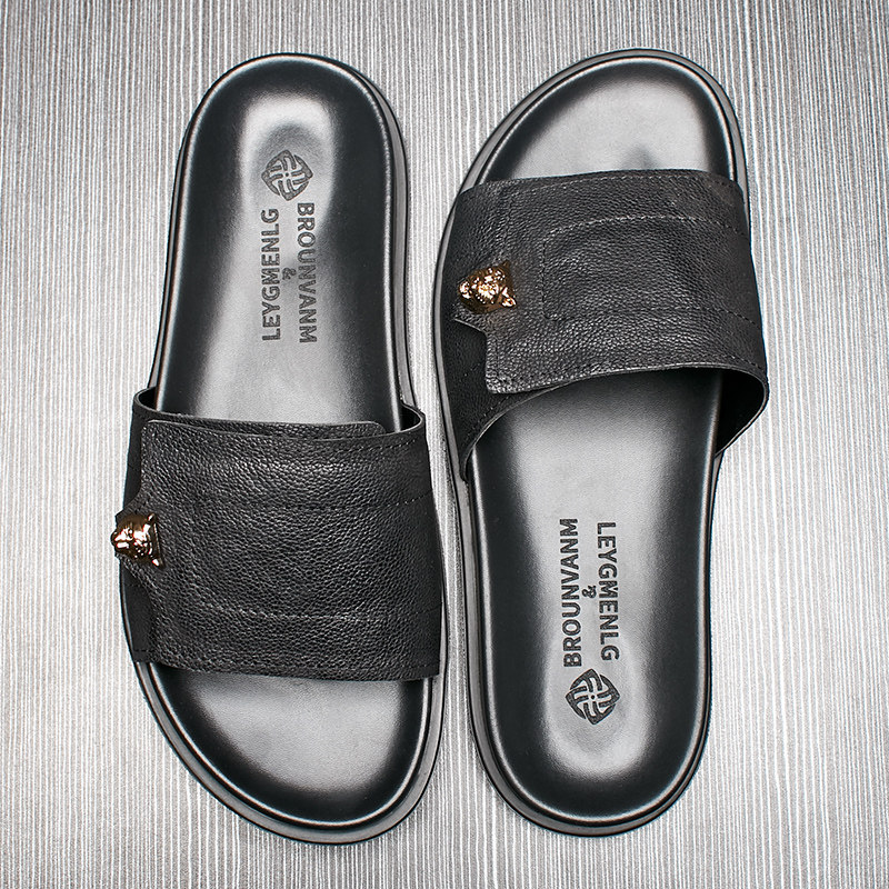 Men's genuine leather driving slippers male and female Summer time outside wearing non-slip word drag trendy net red personality outdoor cool drag male