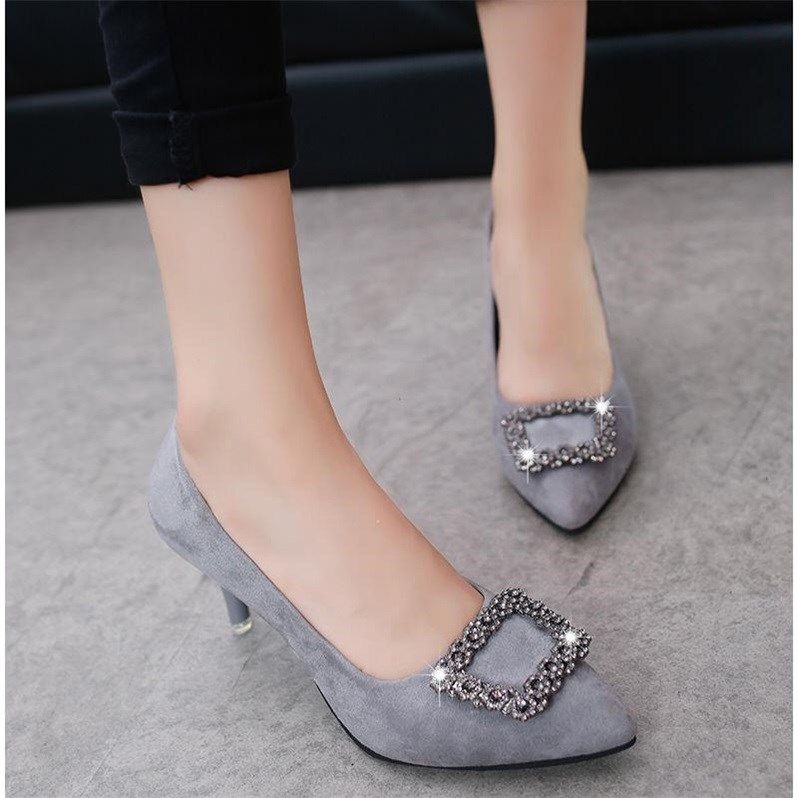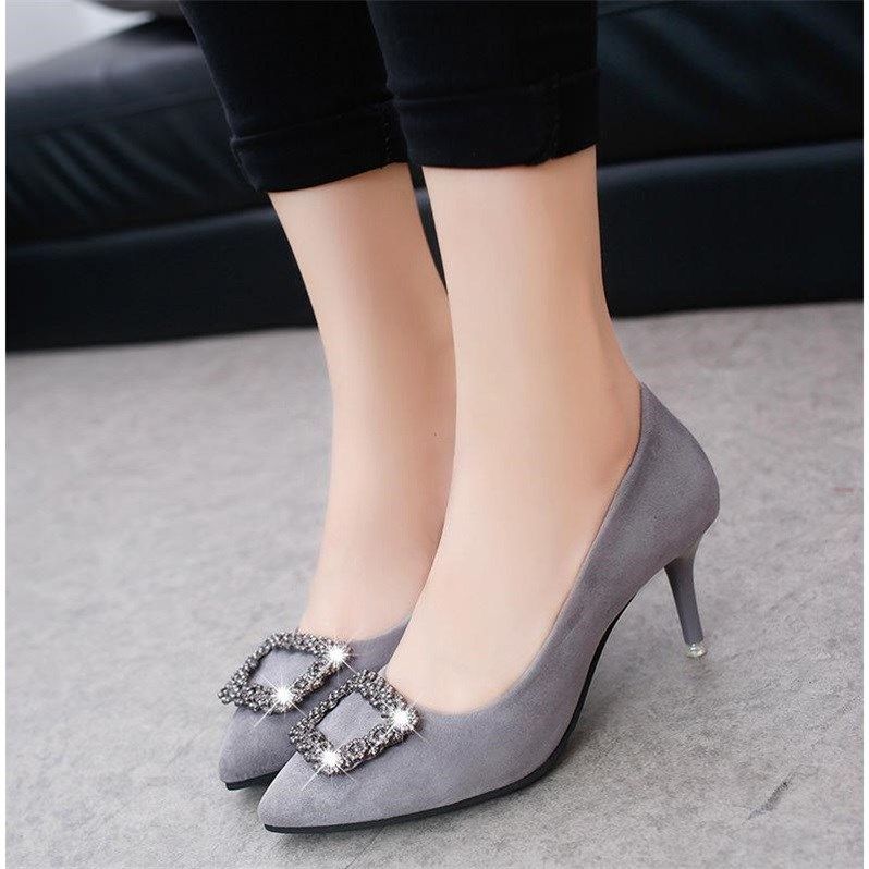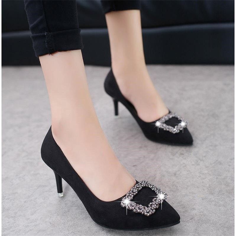 High heel shoe woman 2019 season new pointed fine heel Heel Wrap Shoes Women's Water Drill Square Button Black Working Shoes