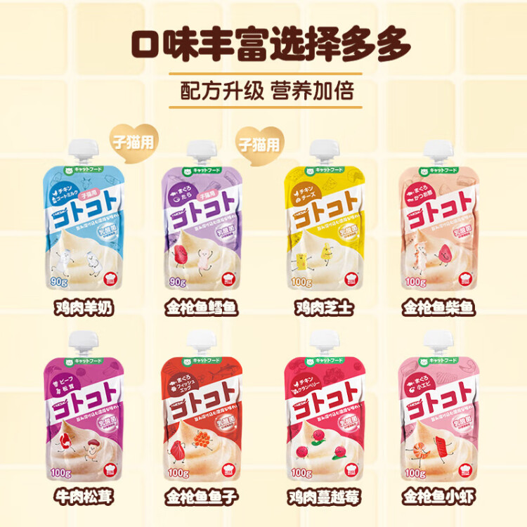Chicken cheese 100g Tuna bonito 100g Chicken cranberry 100g Tuna shrimp 100g Tuna roe 100g Beef matsutake 100g Chicken cream soup 80