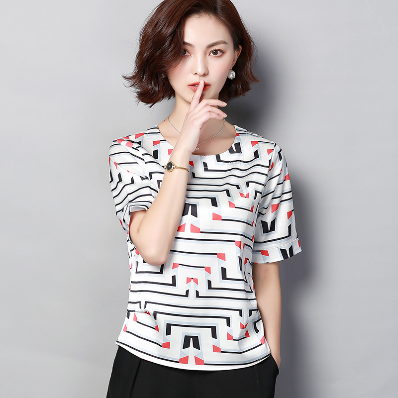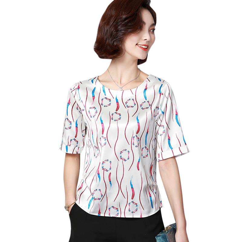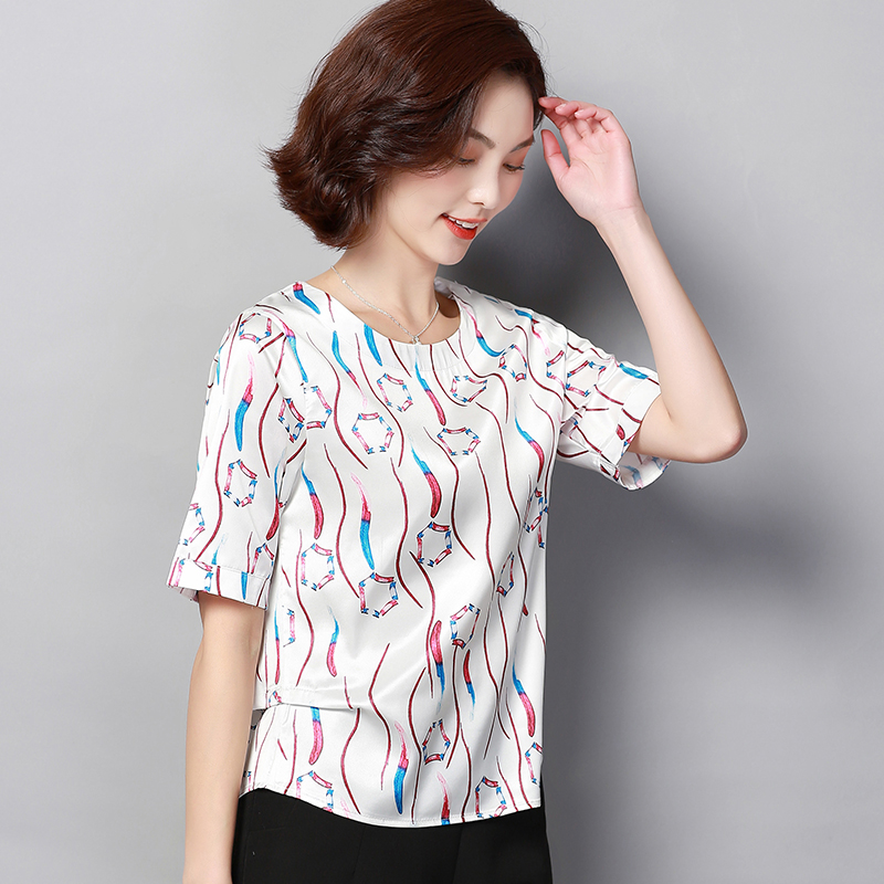 Anti-season silk top short-sleeved women's 2021 summer new fashion printing foreign school mulberry silk satin mom T-shirt