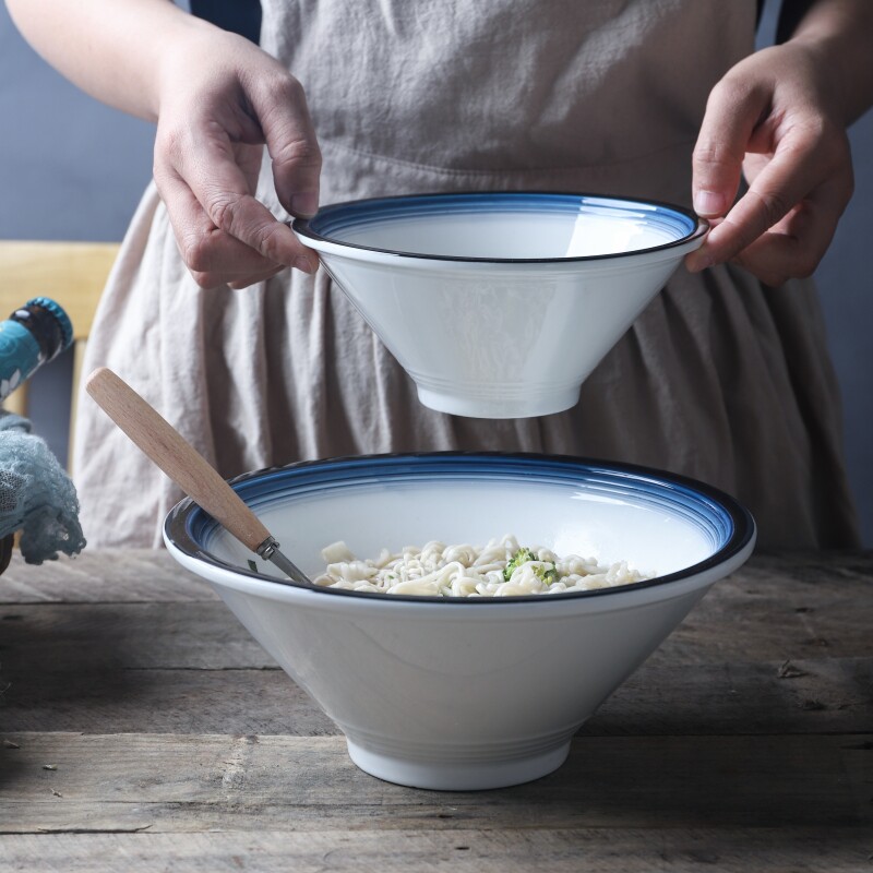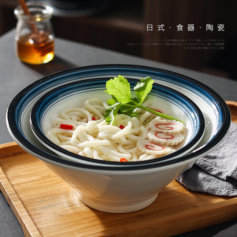 Blue noodle bowl, white porcelain, blue-sided hat bowl, trumpet bowl, straight mouth noodle bowl, creative thread, anti-scalding, small fresh Japanese bowl