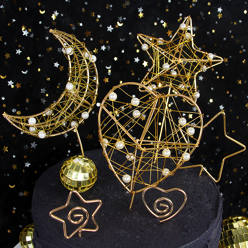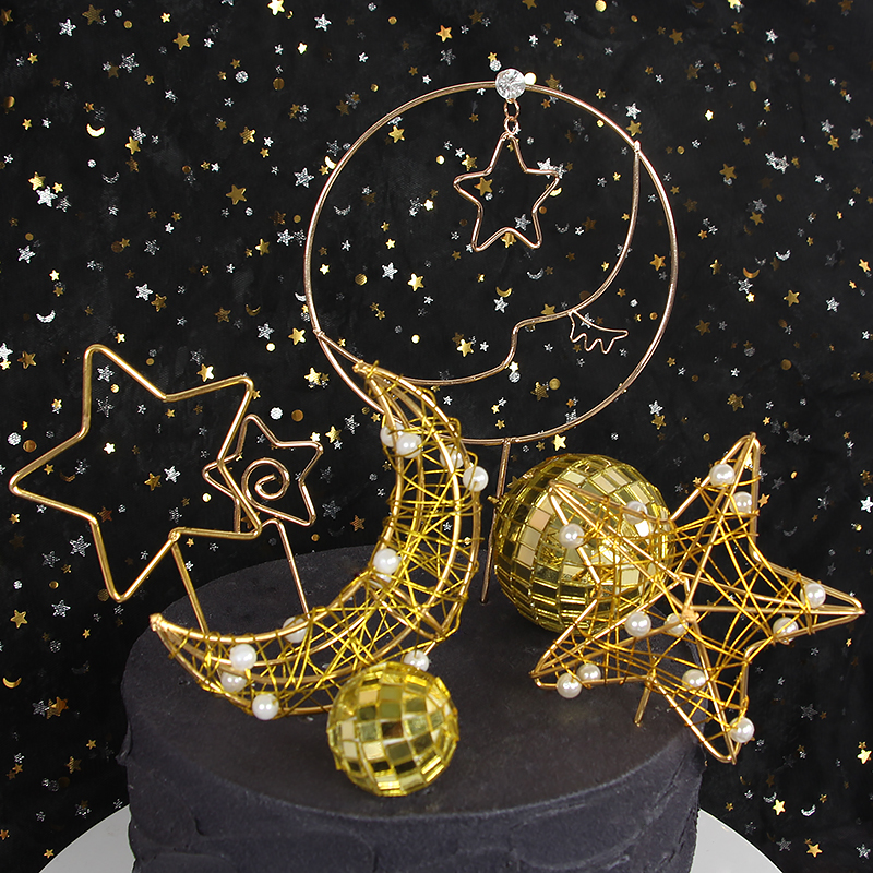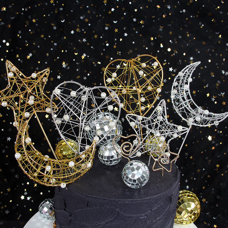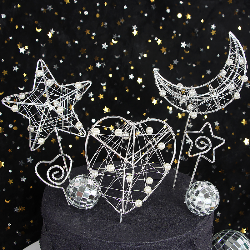 Baking Cake Decoration Meritocratic Pearl Hollowed-out Gold And Silver Iron Wire Moon Stars Loving Plug-in Iron Art Moon Heart