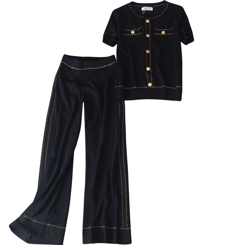 European and American ice silk short-sleeved knitted wide-leg pants trendy brand women's suit small fragrance summer casual two-piece fashion trend