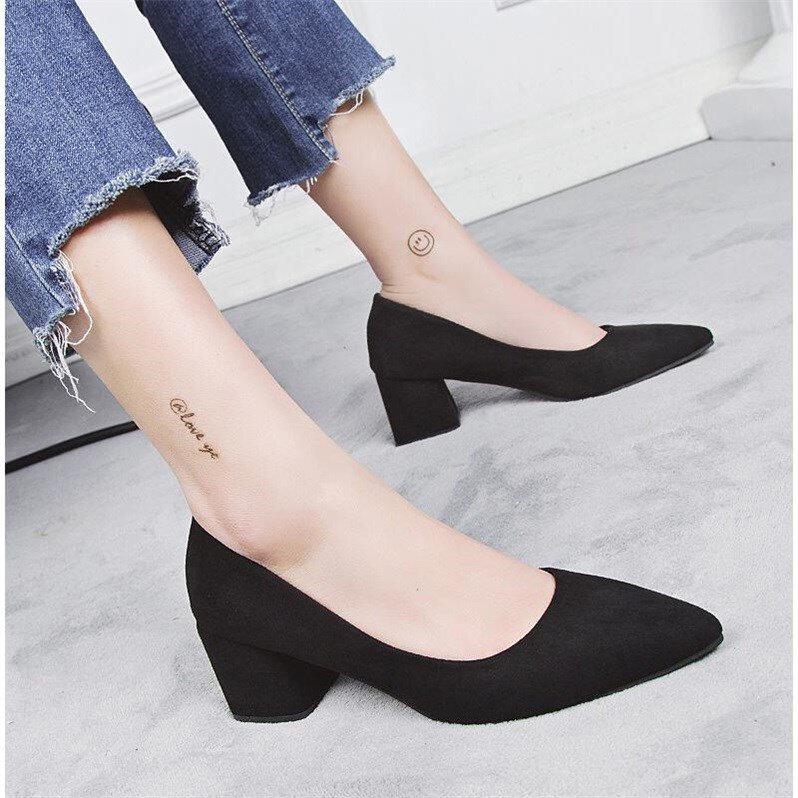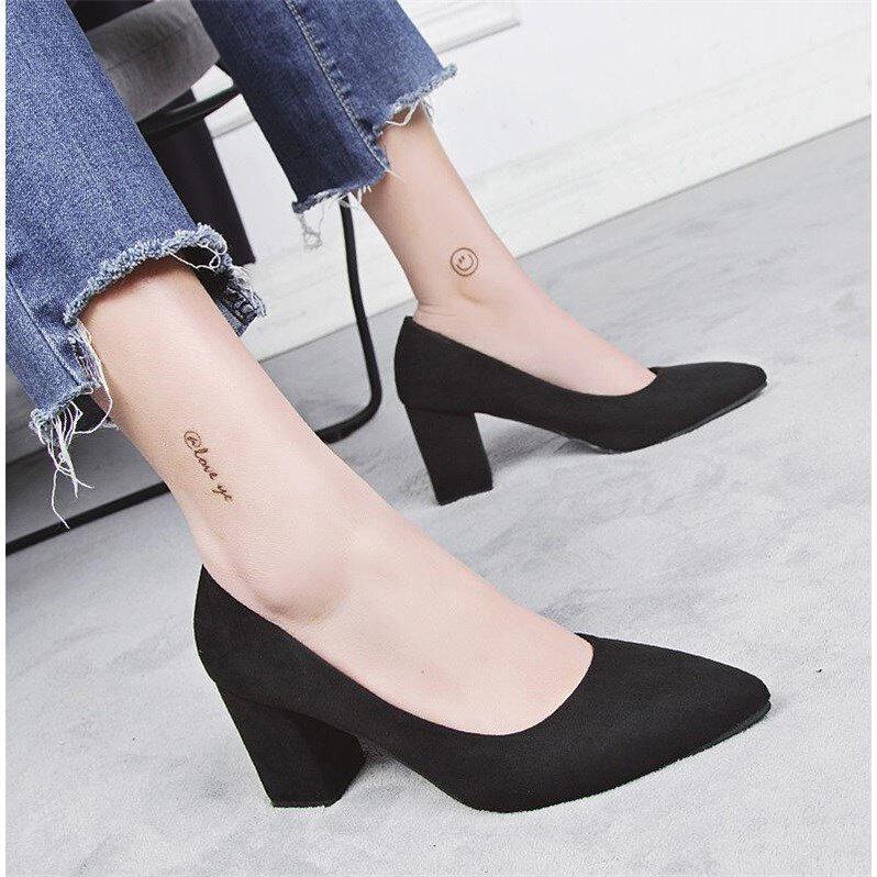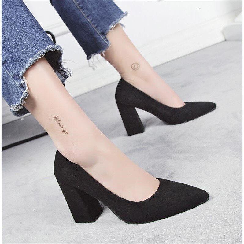 High heel shoes female crude heel 2019 new shoes female Korean version 100 hitch-pointed suede heel covered shoes female