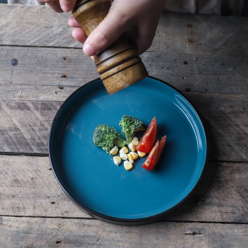 Straight-sided flat-bottomed bowl plate straight mouth plate salad plate dinner plate household shallow soup plate two inner blue outer black creative ceramic plate