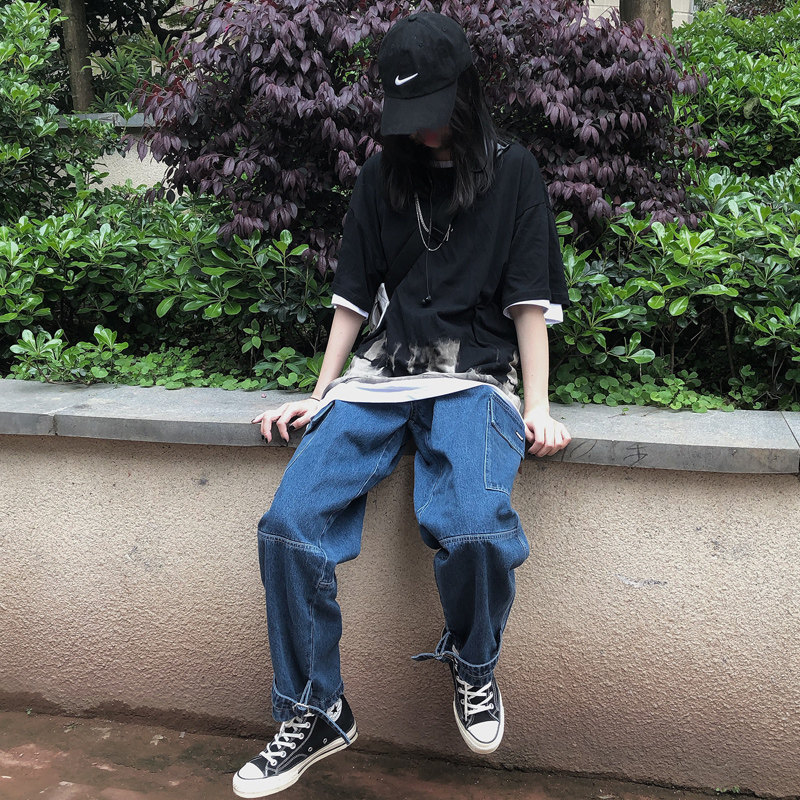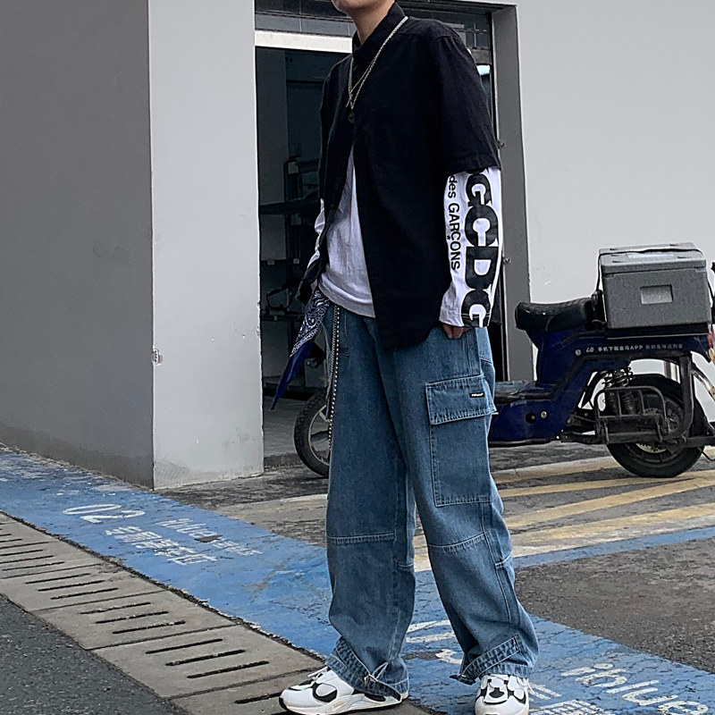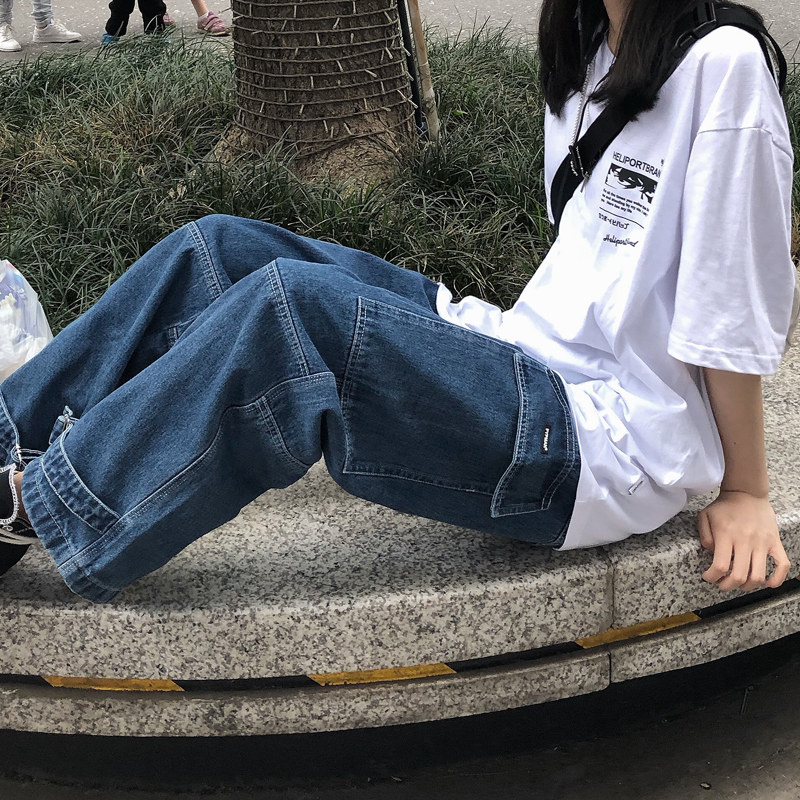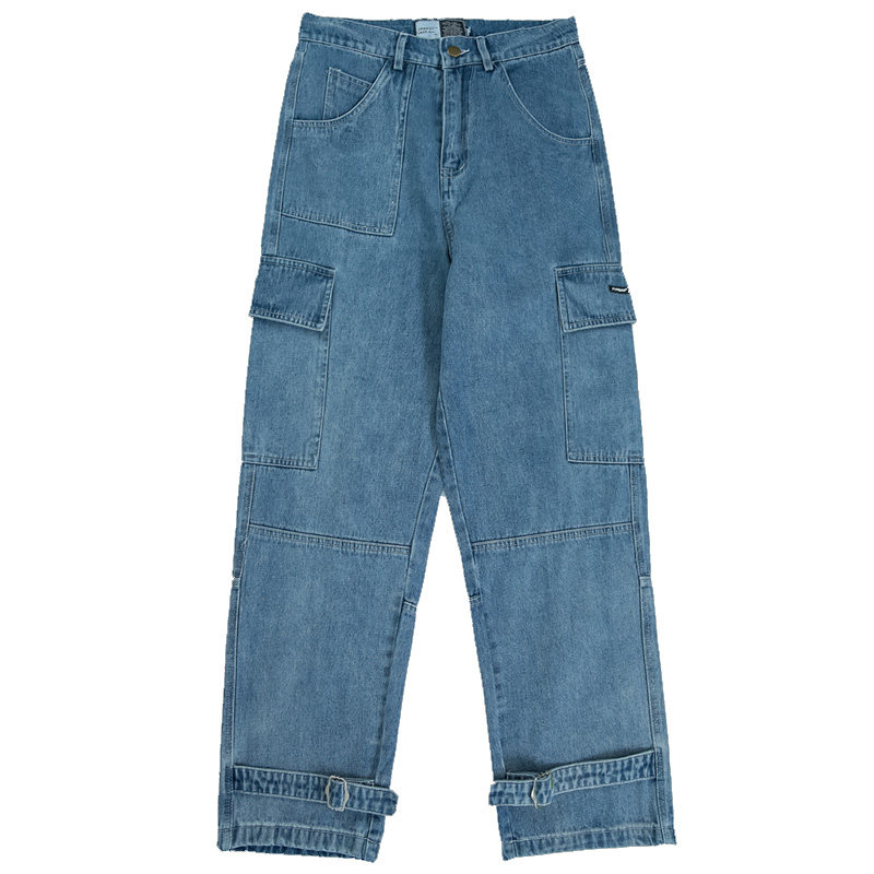 ZBJ national tide jeans women's loose retro drawstring pants washed Japanese straight pants Wide leg multi-pocket overalls