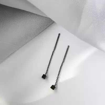 Silver spring spring 925 sterling silver black square earrings long version design sense niche Hong Kong style student female earrings high sense
