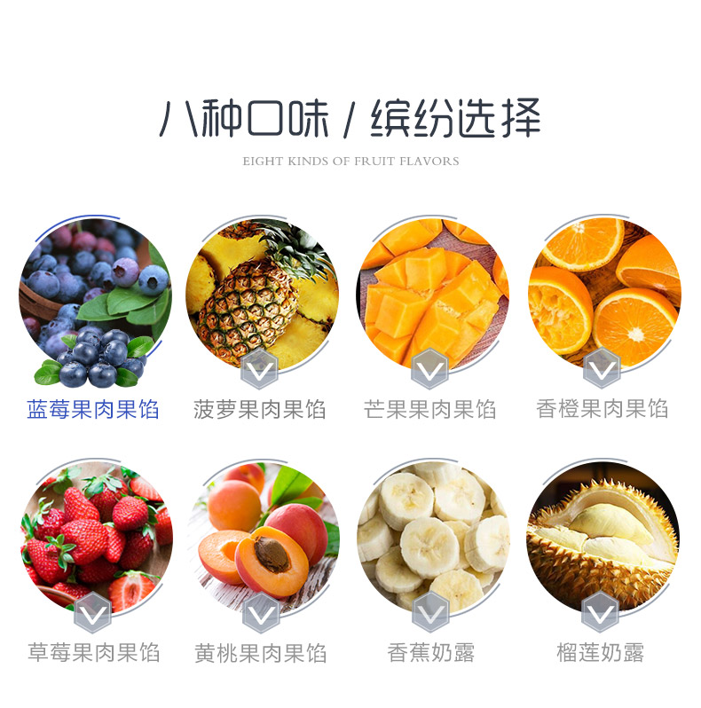 Durian milk dew Banana milk dew Mango milk dew Strawberry fruit filling (with pulp)Blueberry fruit filling(with pulp)Pineapple fruit filling (with pulp)Yellow peach fruit filling (with pulp)Mango fruit filling (with pulp)Mixed fruit fruit