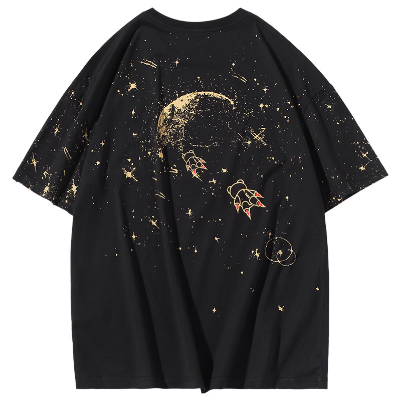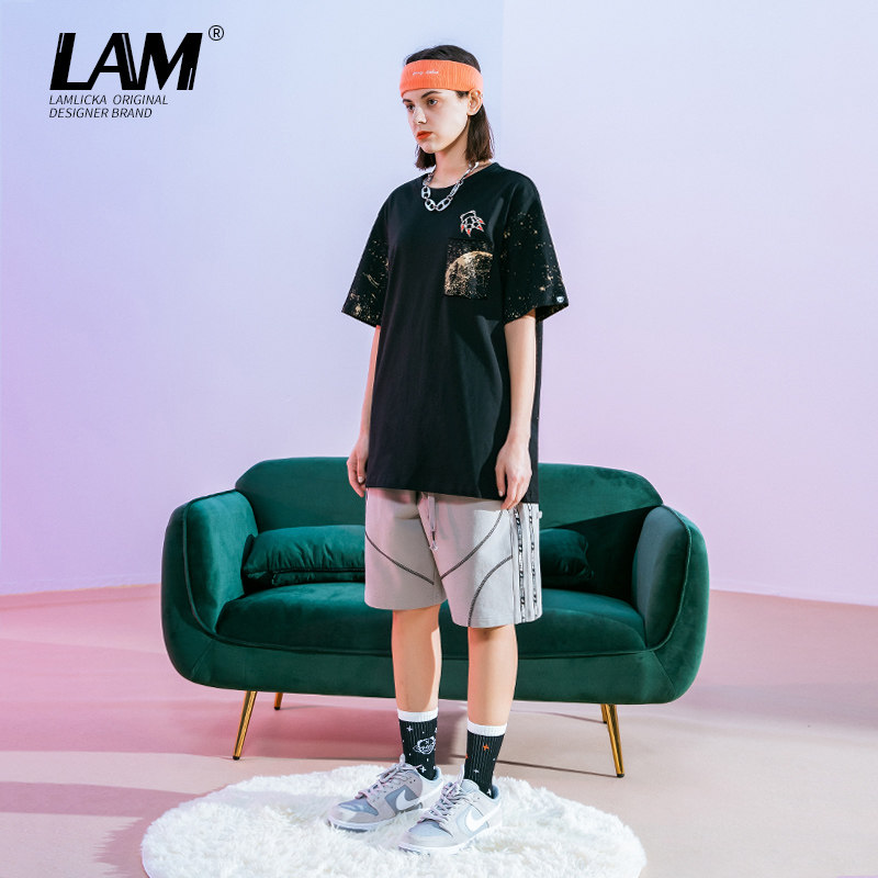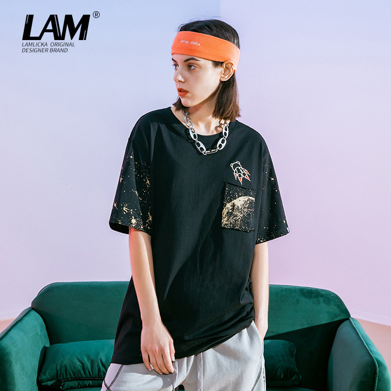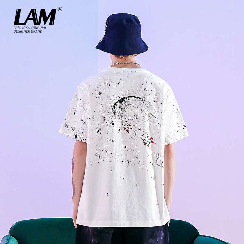 LAMLICKA summer embroidery panda starry short sleeve T-shirt men's Tide brand Super fire wild wild loose couple half sleeve