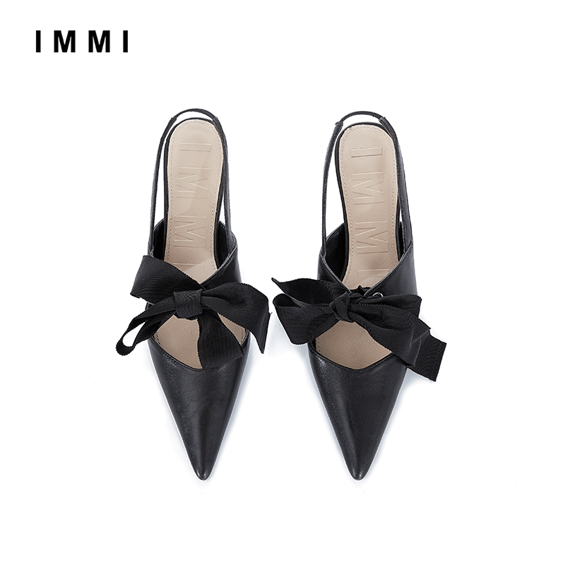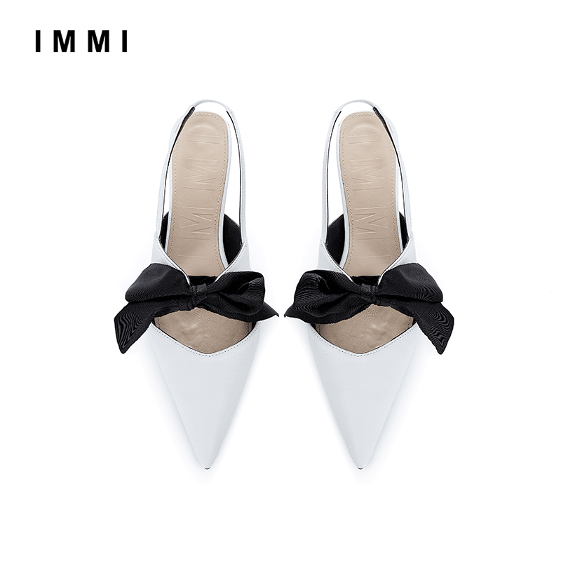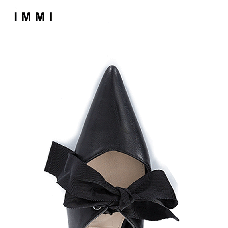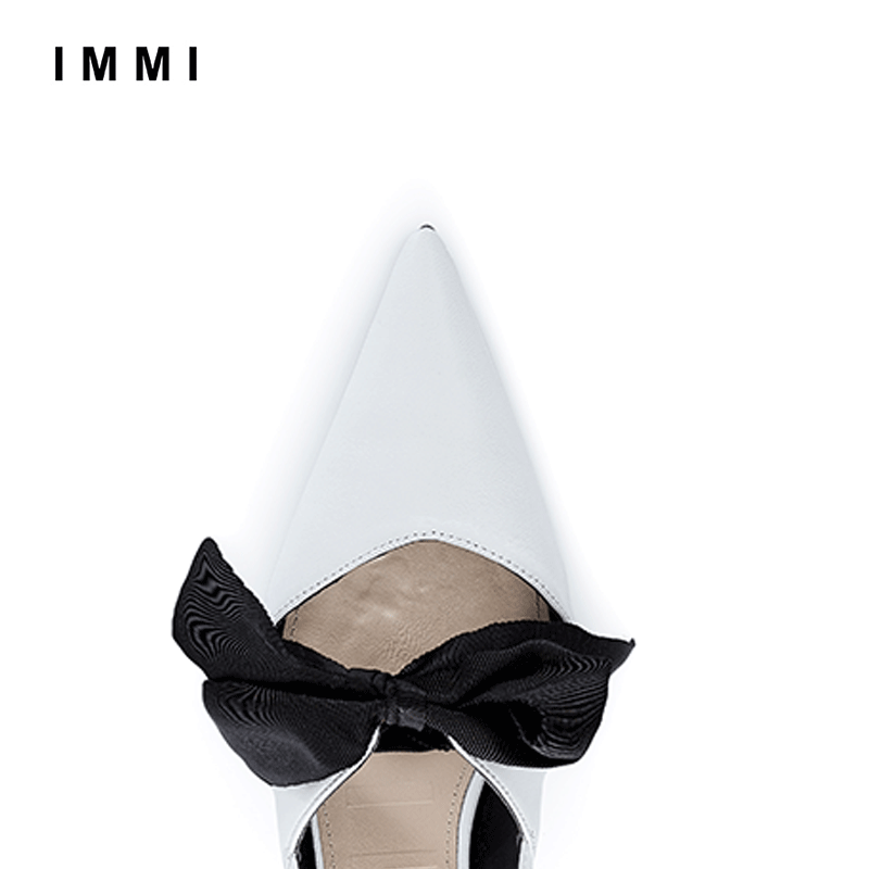 (designer brand IMMI) pointed black and white sheepskin butterfly knot cat heel high heel shoe 191SH005