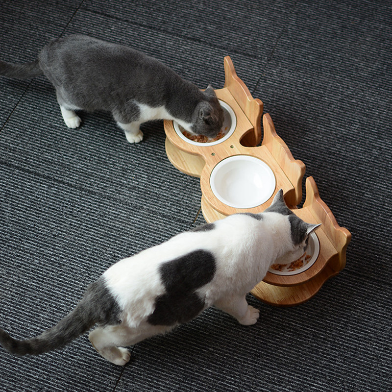 Cat bowls ceramic protection cervical spine double bowl drinking water inclined opening stainless steel three bowls anti-overturning multi-cat food triples
