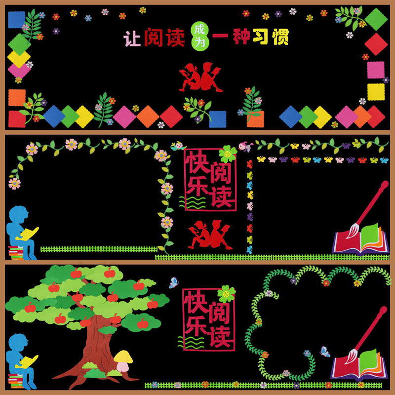 Pen and book reading boys back-to-back boys and girls Happy reading makes reading become a habit green flowers trees one happy reading Second happy reading Three makes it a habit to read